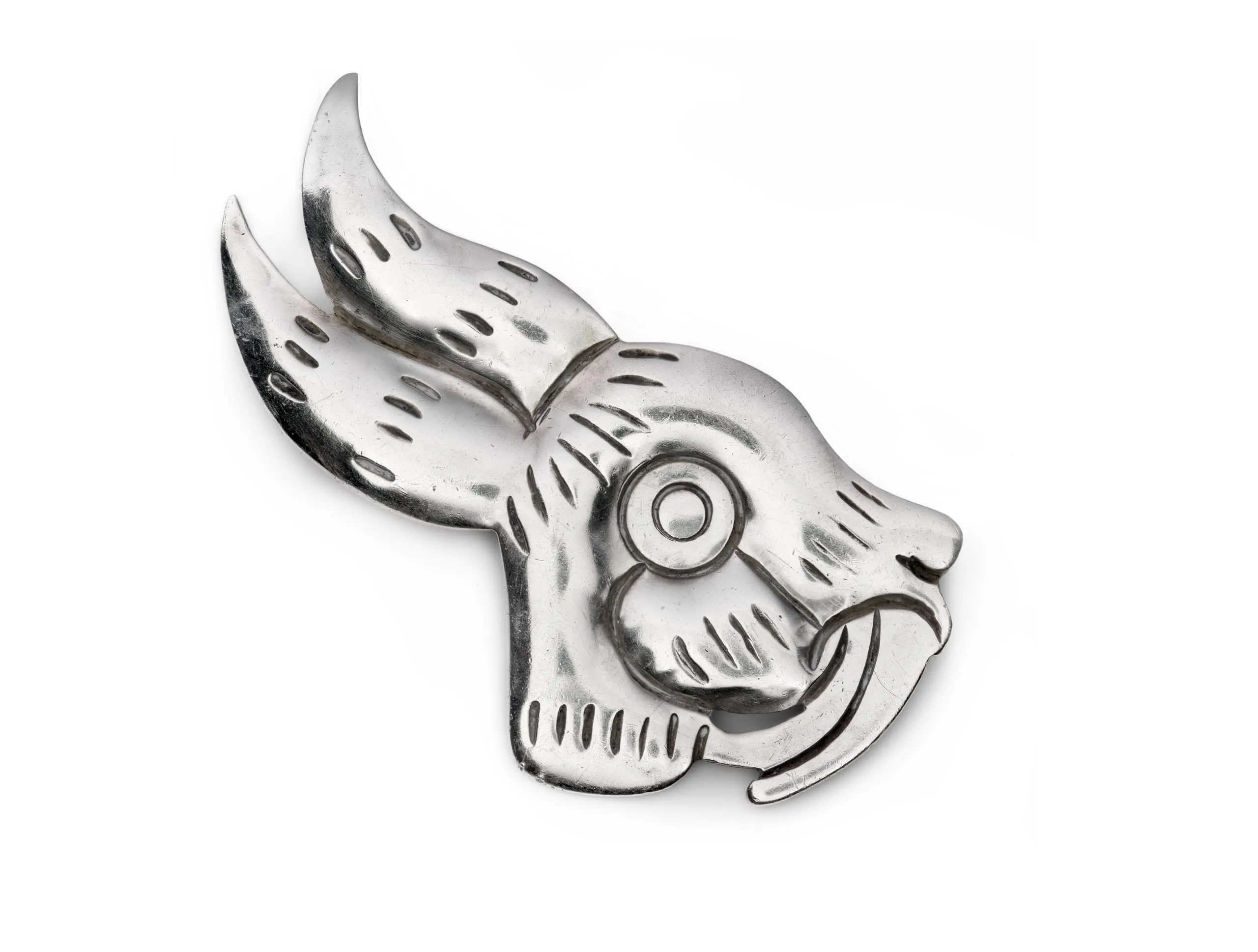 Héctor Aguilar was one of Taxco’s most talented designers. In 1935 he began working for William Spratling (1900–1967) as a shop manager at the Taller de Las Delicias. Two years later he apprenticed with Spratling, and by 1939 he opened his own workshop, the Taller Borda, recruiting and training hundreds of silversmiths and going on to become one of the leading silver industries of Taxco. Many of Aguilar’s objects show his interest in ancient art and architecture, including this rabbit brooch—part of a set that represents Aztec and Mixtec calendric symbols.