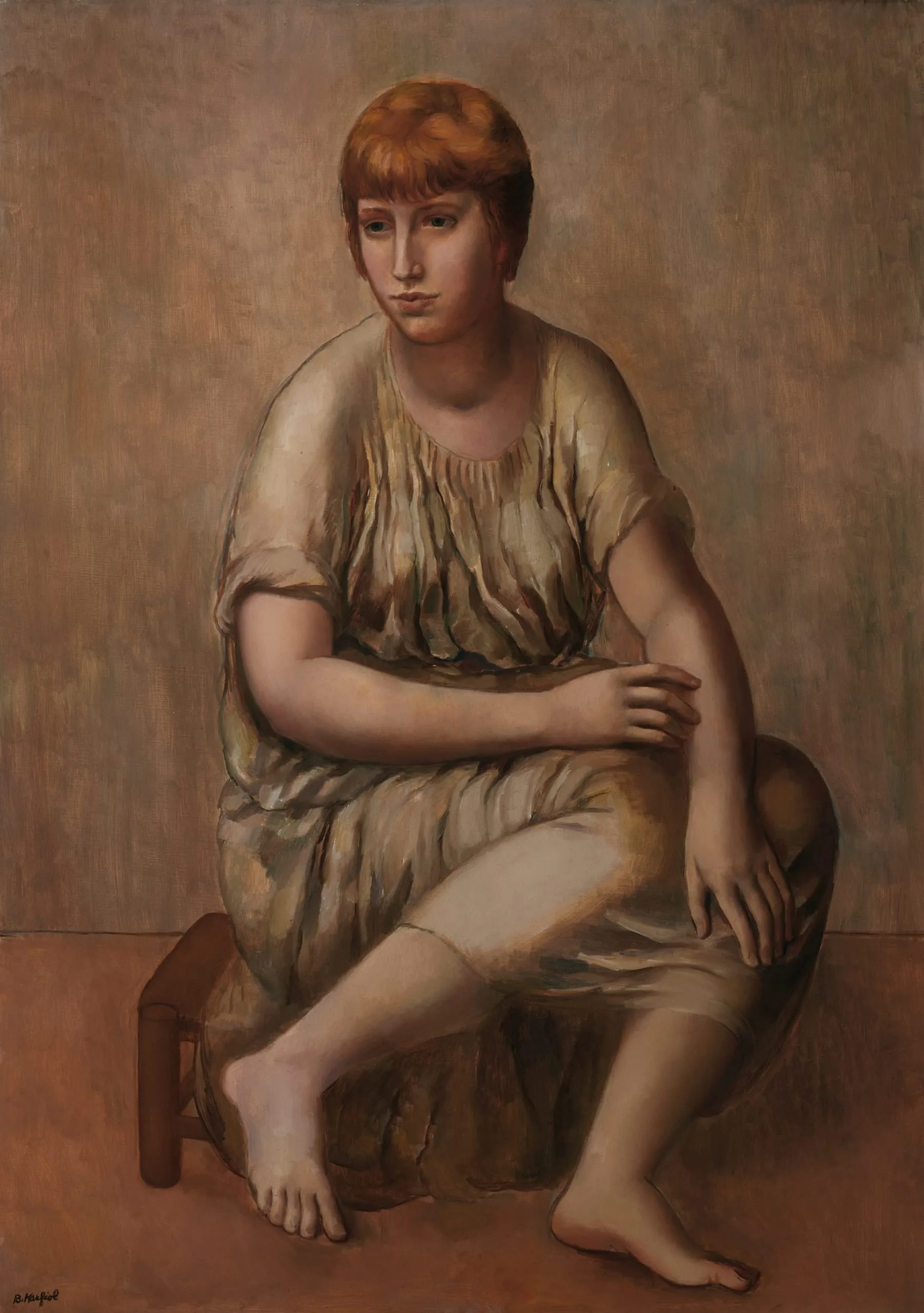 In the 1920s Karfiol’s art became more classical as he focused on standing nudes, odalisques, and females dressed in loose gowns of indefinite period. Along with his classicism went a modernist interest in color and form, which was inspired in part by Paul Cézanne (1839-1906) and Pablo Picasso (1881-1973). The woman in Seated Figure is fully modeled, as would be expected of an academically trained artist such as Karfiol, but her body has been simplified into solid geometric forms. She is placed in the center of the composition, sitting on a stool. The stool is actually too small and low to enable the woman, who is quite massive, to sit comfortably. She appears to be comfortable, however, because her pose gives the form of a pyramid, producing an effect of stability. She appears almost stonelike due to the monochromatic beige and white palette. Only by subtly varying the tones of pink, yellow, and brown for the flesh did Karfiol suggest that the figure was alive.