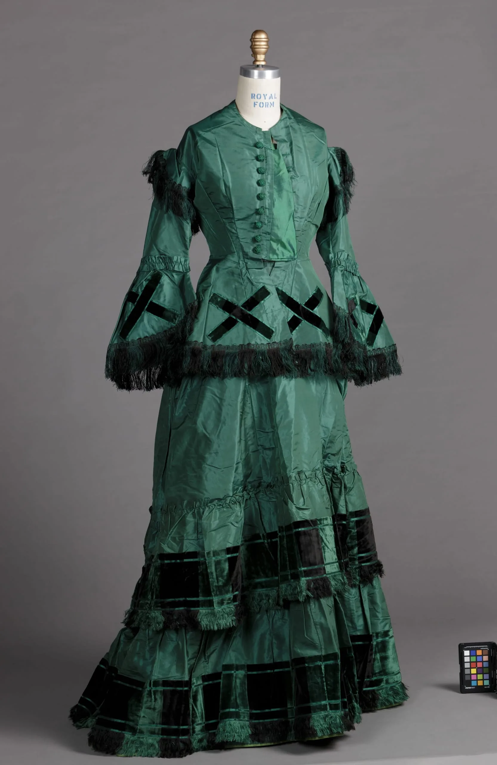 - Day bodice: silk plain weave (taffeta), silk velvet with satin weft patterning, silk braid with fringe; Evening bodice: silk plain weave (taffeta), silk braid with fringe; Skirt: silk plain weave (taffeta), silk velvet with satin weft patterning and silk fringe; Belt: silk plain weave (taffeta) and silk velvet with satin weft patterning; Flounce: silk plain weave (taffeta) with satin weft patterning and silk fringe, silk velvet