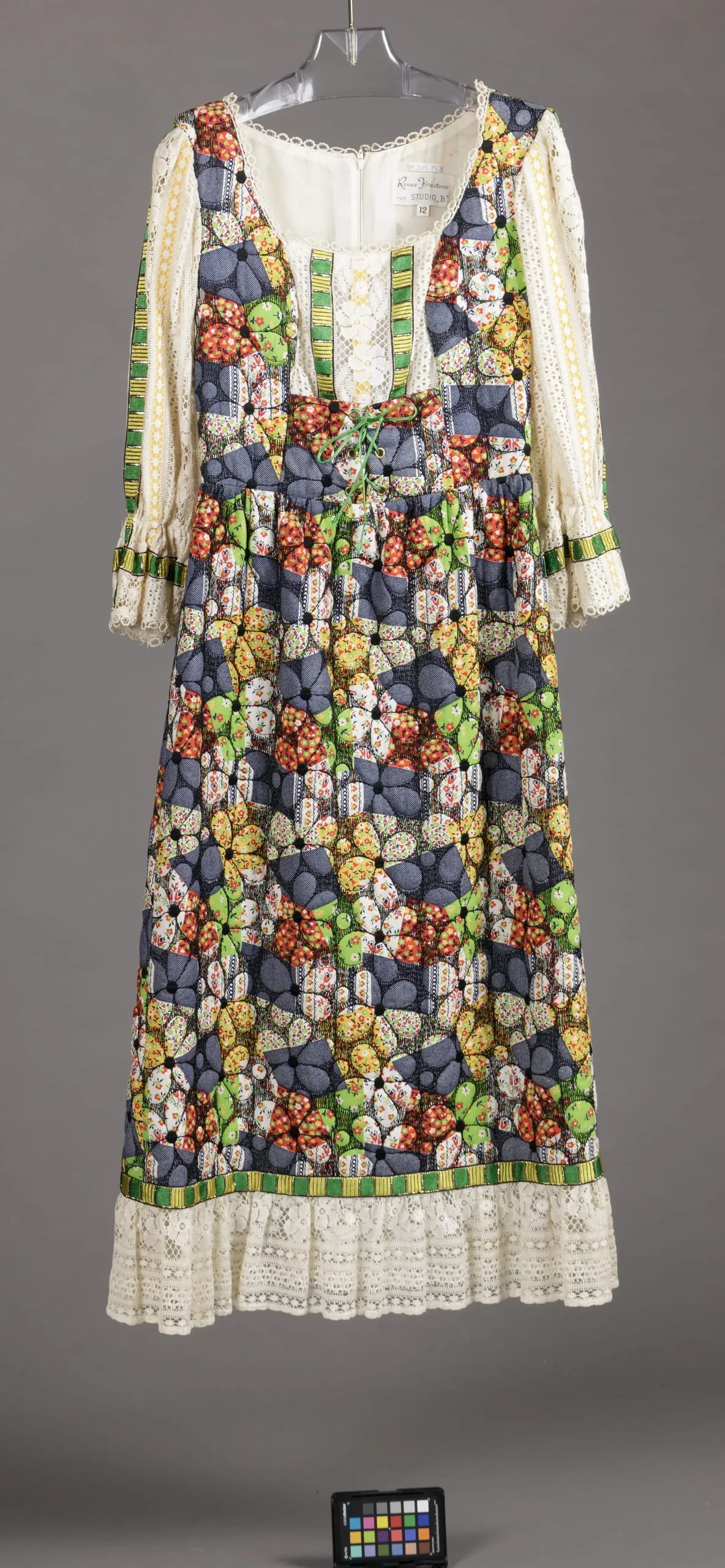 - Cotton plain weave, printed and quilted; cotton machine-made lace; rayon and metallic thread novelty weave ribbon; metal grommets; nylon cord