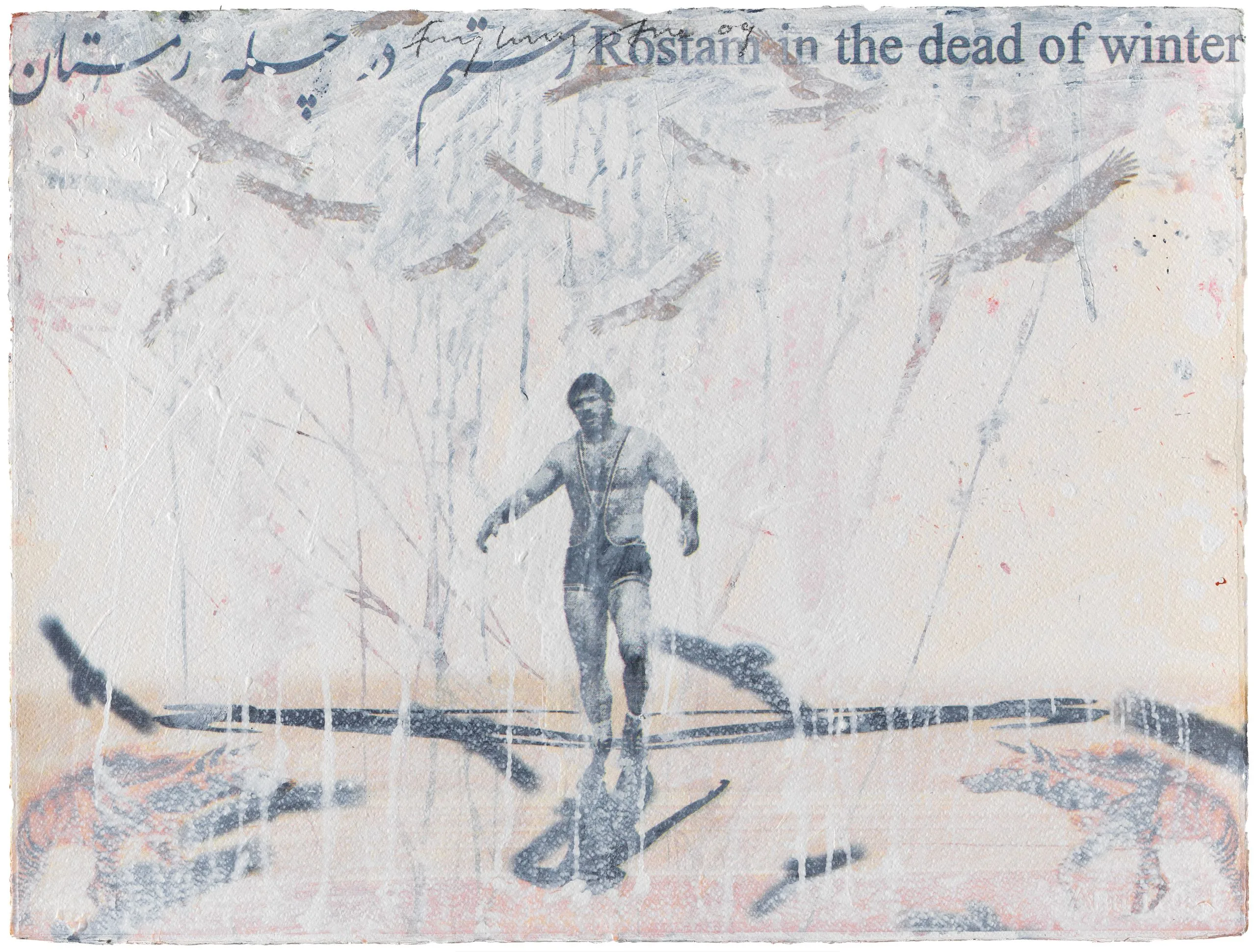 Fereydoun Ave has created several series featuring the epic hero Rustam represented by photographs of Abbas Jadidi, an Iranian wrestler who won the 1996 Olympic silver medal. While Rustam is portrayed as triumphant in other works, here, in a hostile environment populated by hyenas and vultures, he is bereft. The ominous splashes of red paint, the wild animals, and Rustam’s isolation and visible exhaustion suggest an unfavorable end for the diminished hero.