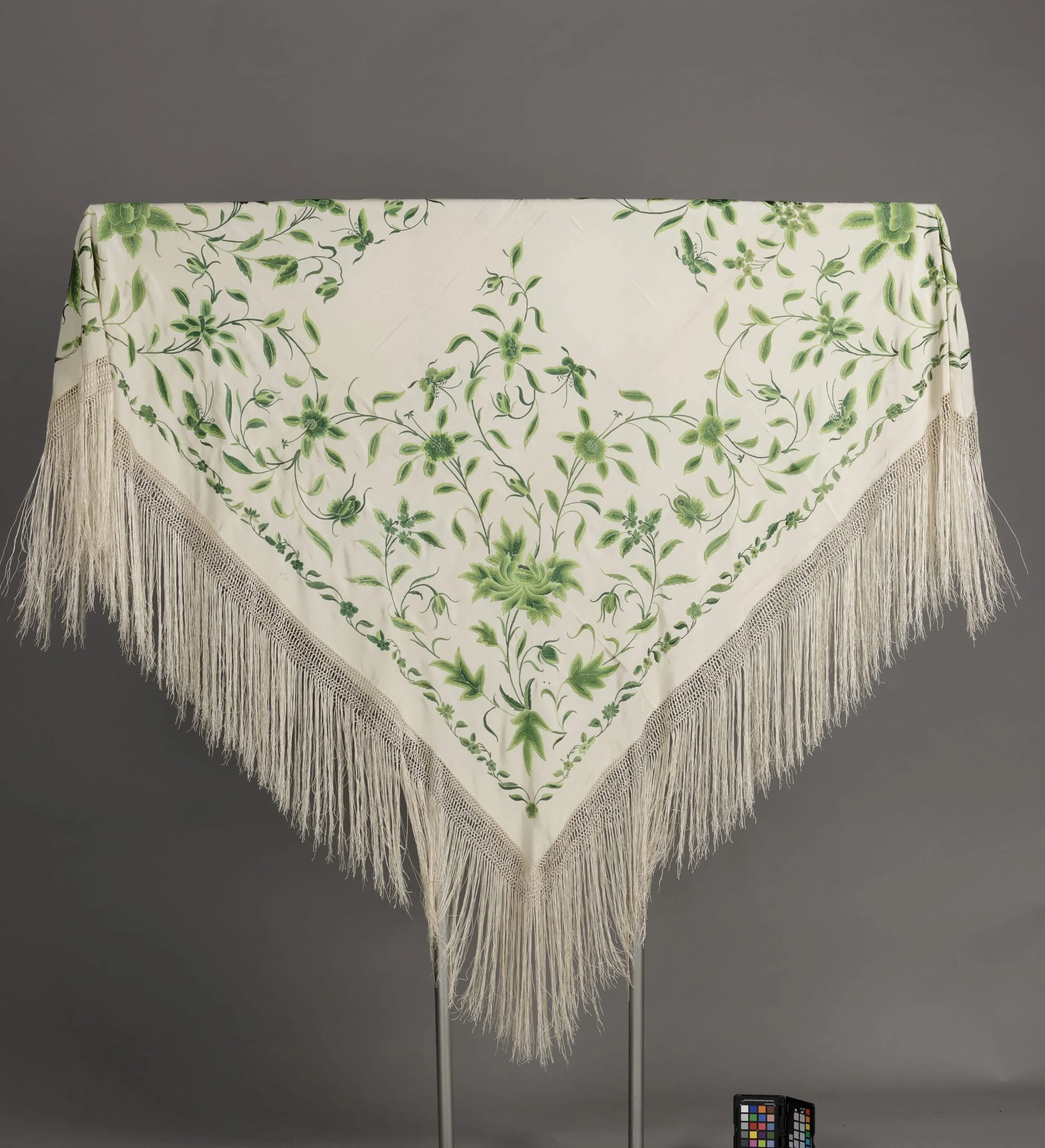 - Silk plain weave (crepe) with silk embroidery and silk macramé and fringe