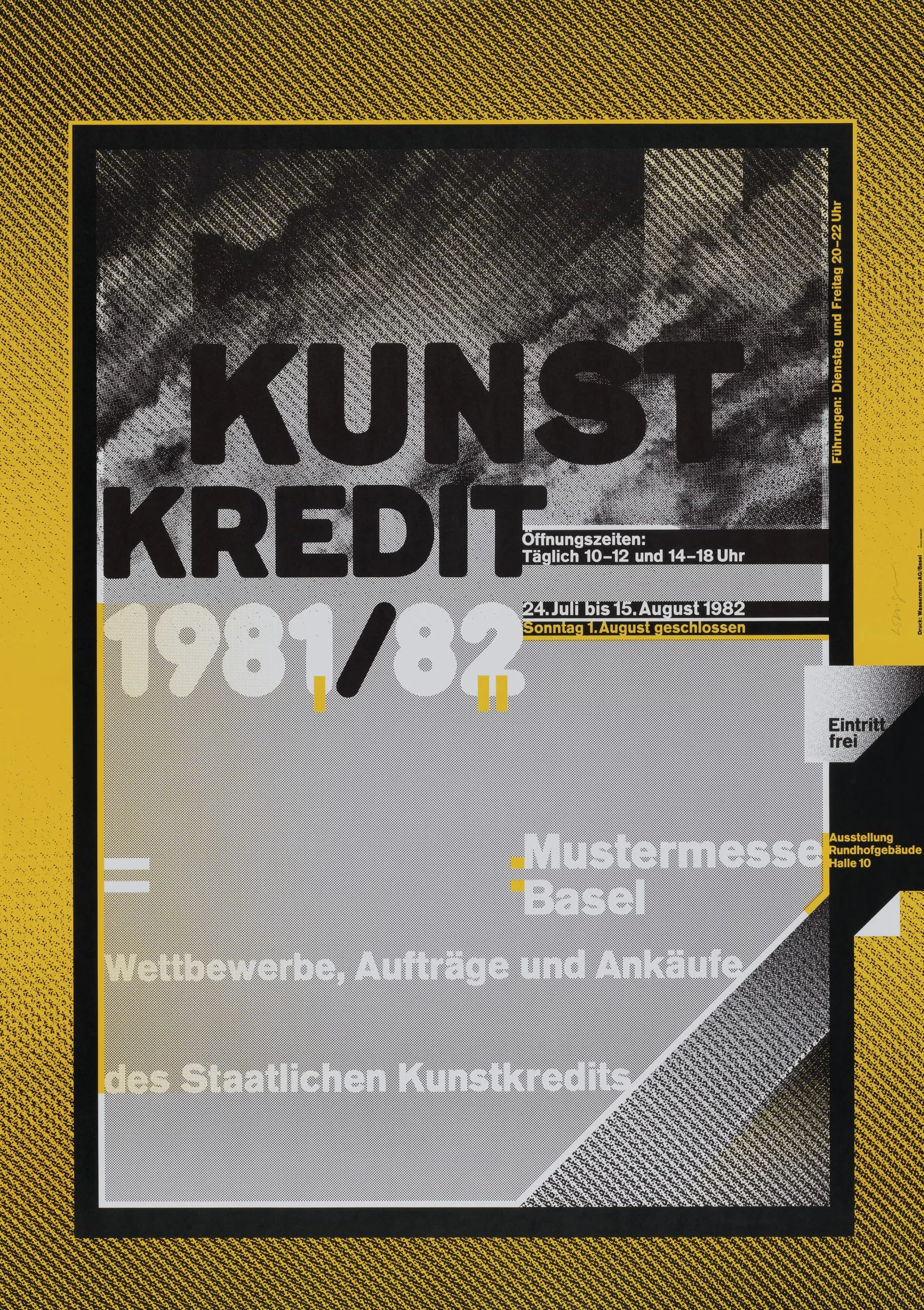 Vertical graphic design poster in black, white, gray, and canary yellow with bold sans-serif type announcing 'KUNST KREDIT 1981/82' and exhibition details in German