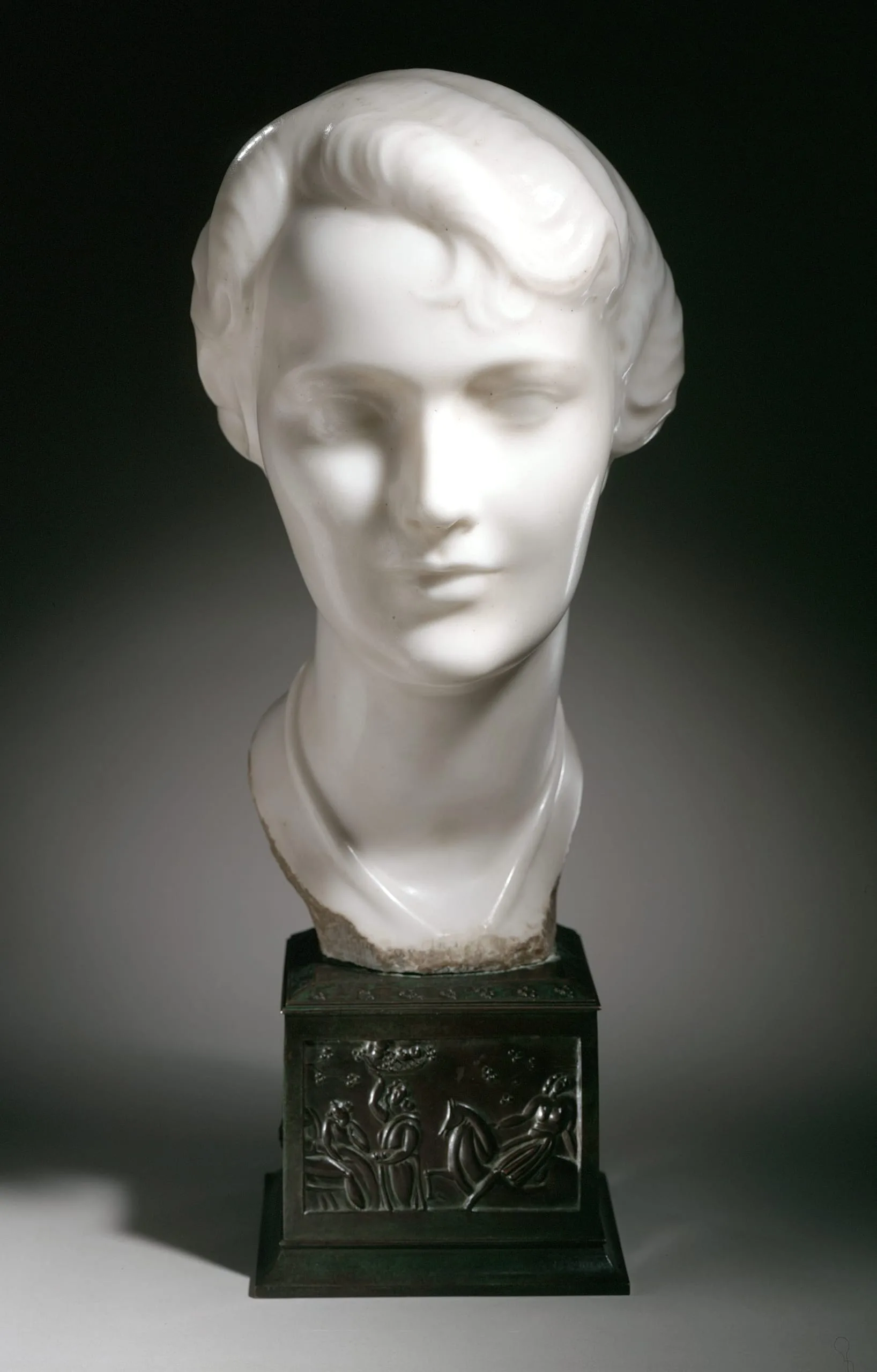 Nadelman’s introduction to New York was largely through Martin Birnbaum, a junior partner at the firm of Scott & Fowles, the artist’s dealers from 1915 to 1925, who organized two successful exhibitions of his work in 1917 and 1925. In about 1916 Nadelman carved a marble bust of the firm’s senior partner, Steven, son Scott (Joslyn Art Museum, Omaha). In 1915 Nadelman began studies for Portrait of a Little Girl, 1916 (Metropolitan Museum of Art, New York), a three-quarter-length marble sculpture of Scott’s daughter. Nadelman completed portraits of the family with this head of Mrs. Stevenson Scott, Marie, carved in 1919.