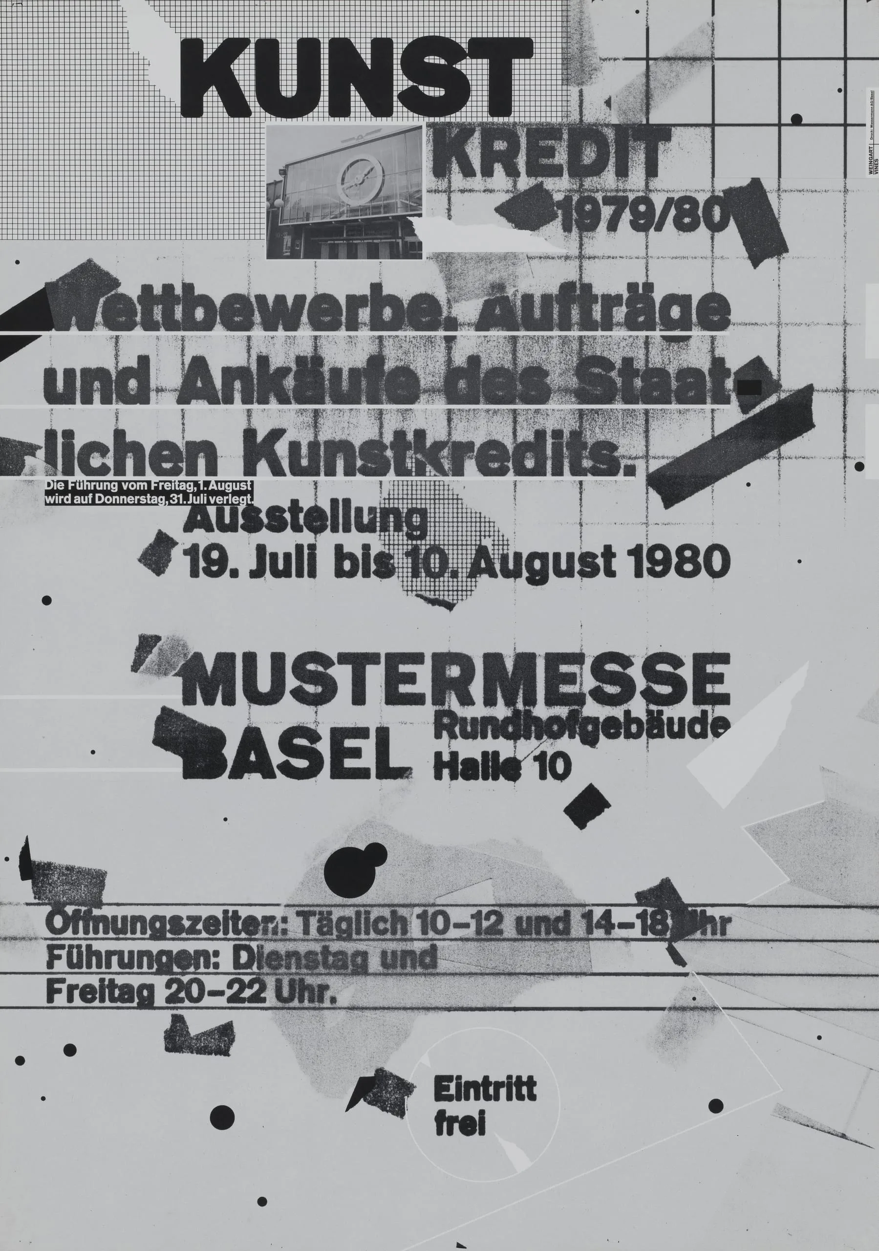 Black and white offset printed exhibition poster with bold German text at varying scales, geometric collage shapes, and halftone photographic fragments on white paper