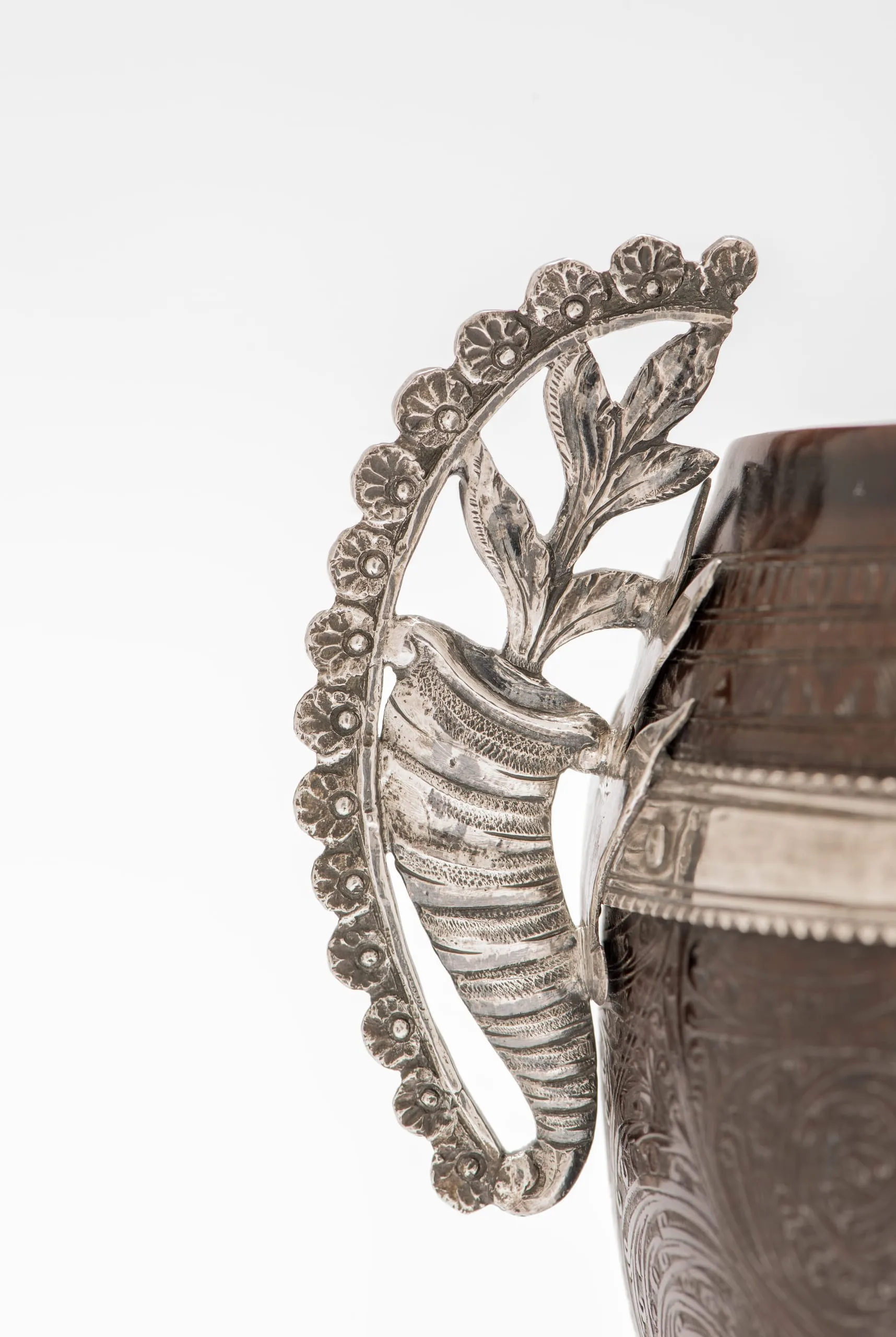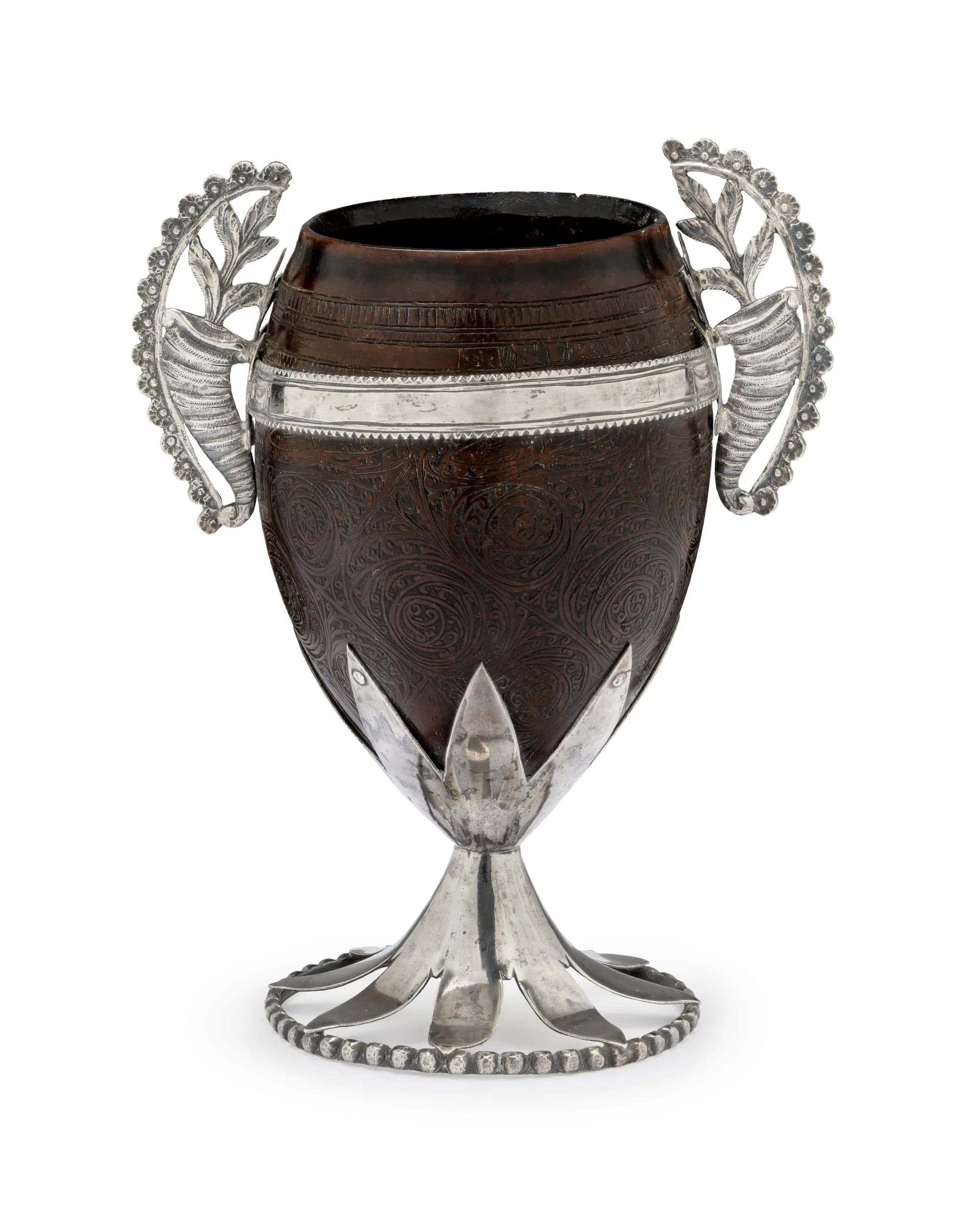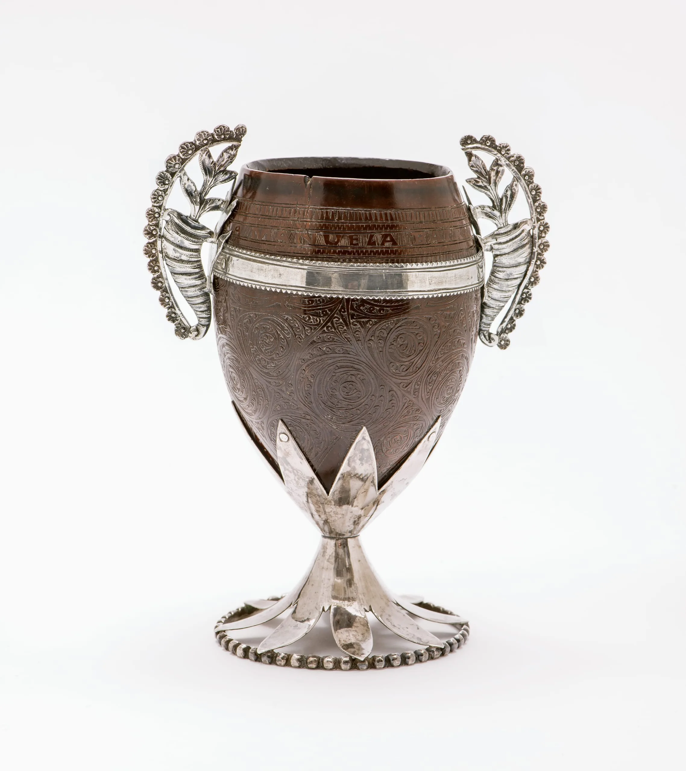 Coconut-shell cups were luxury items used for drinking hot chocolate. Cacao beans and chocolate beverages played an important role in Aztec and Maya rituals, and were mostly consumed by members of the nobility. By the seventeenth century, coconut-shell cups, used for drinking hot chocolate, were ubiquitous in the homes of viceregal society. The Spanish penchant for the precious elixir made these artifacts highly desirable exports. Many were fitted with silver bases and handles, and some were embellished with inscriptions identifying their owners, as this example that includes an inscription on the rim: "Sirvo a Doña Manuela Batres" ("I serve Doña Manuela Batres”). Although chocolate was native to the Americas, the coconut palm was introduced to Mexico from Asia in the sixteenth century.