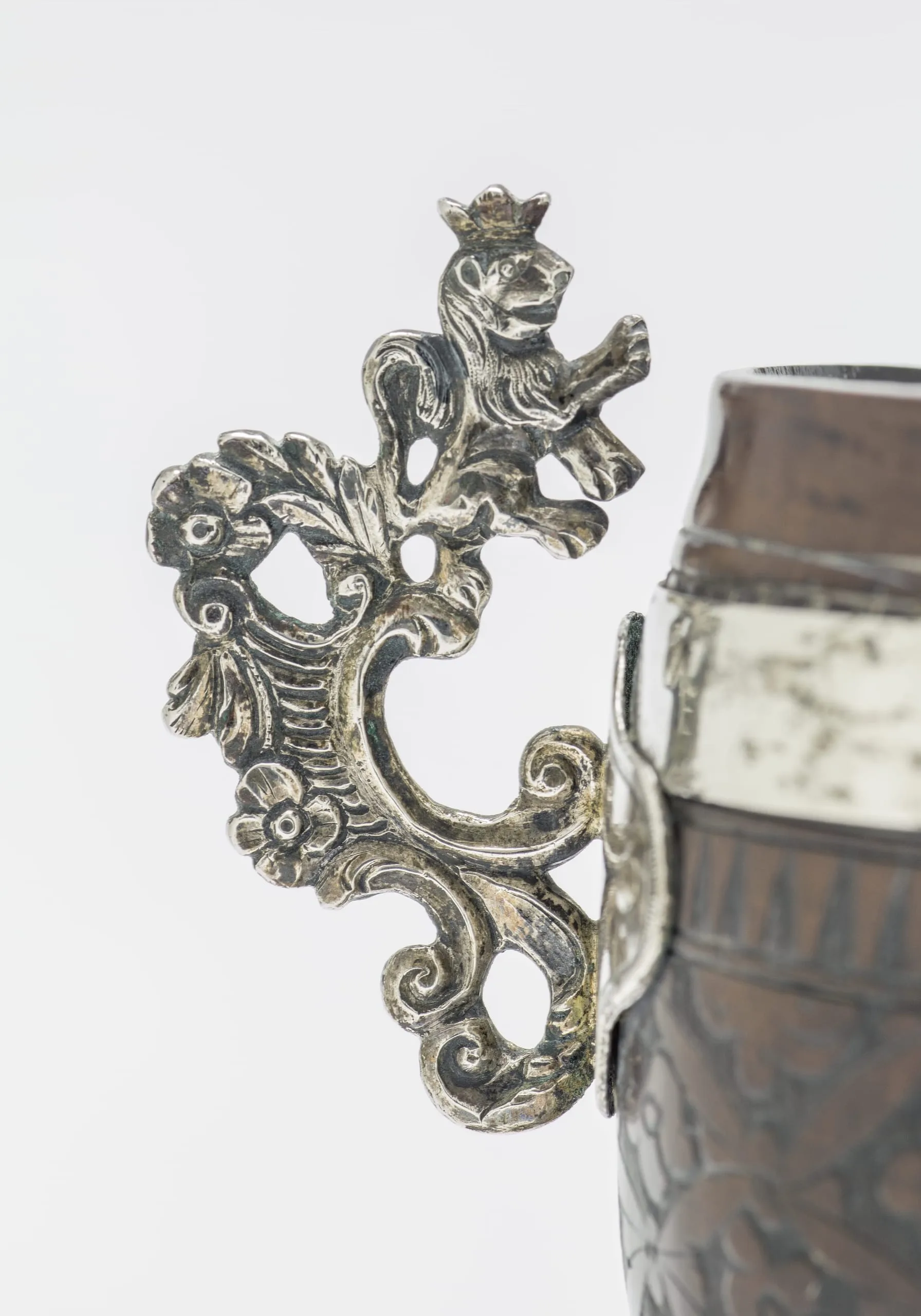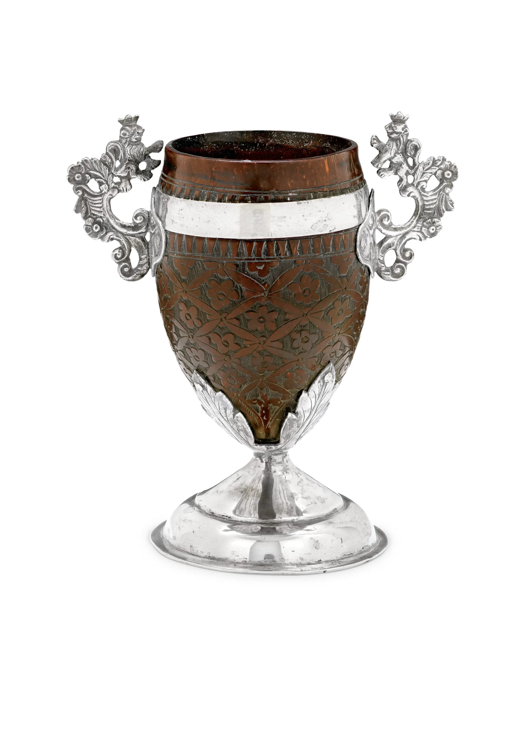 Coconut-shell cups were luxury items used for drinking hot chocolate. Cacao beans and chocolate beverages played an important role in Aztec and Maya rituals, and were mostly consumed by members of the nobility. By the seventeenth century, coconut-shell cups, used for drinking hot chocolate, were ubiquitous in the homes of viceregal society. The Spanish penchant for the precious elixir made these artifacts highly desirable exports. Many were fitted with silver bases and handles, and decorated with a range of engraved motifs. Although chocolate was native to the Americas, the coconut palm was introduced to Mexico from Asia in the sixteenth century.