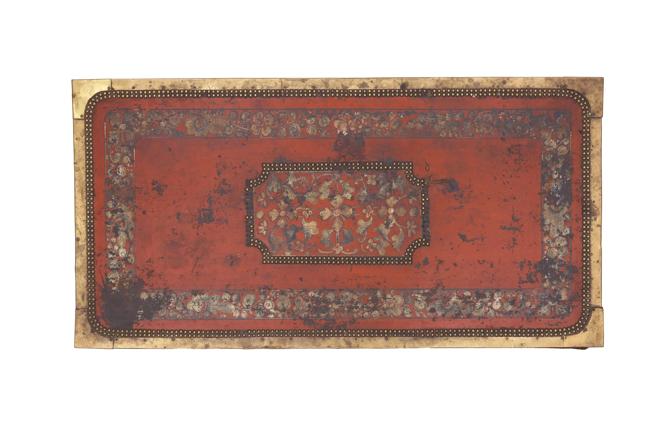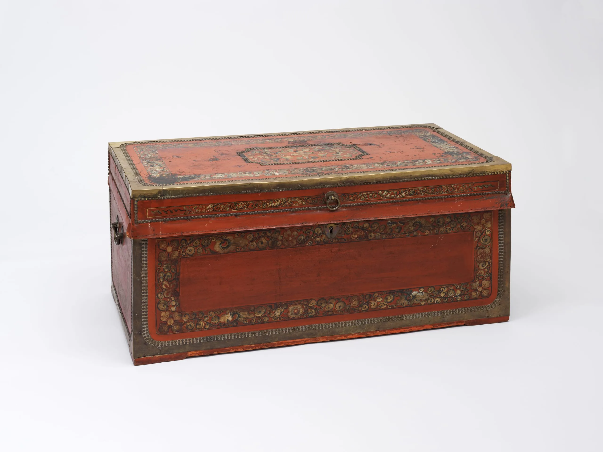Covered in red leather and adorned with painted floral borders and brass mountings, this trunk is made of fragrant camphorwood and was produced exclusively for export, likely in Canton, China. Camphorwood, which comes from a large evergreen native to China, Indonesia, and Brazil, was long used in China to make cabinets for storing important documents, as the wood naturally repels insects. Due to the natural insecticidal properties of the wood, these trunks were also very popular with the military, whose woolen uniforms faced constant infestation on long campaigns. The trunks were made in various sizes, usually in nesting sets that ranged from two to five feet in length. The smallest trunk would often be packed with tea. The leather was generally painted and ornamented with floral motifs or decorative swags fashioned of tacks. By the eighteenth century, European traders regularly commissioned orders of Western style furniture from Chinese craftsmen, often providing a design or sample to be copied. While many examples of Spanish colonial decorative arts adapt Oriental types and decorative motifs, these travel trunks, also called "sea trunks," were specifically made by Chinese workshops for Western consumption, many of which found their way to Latin America and the US.