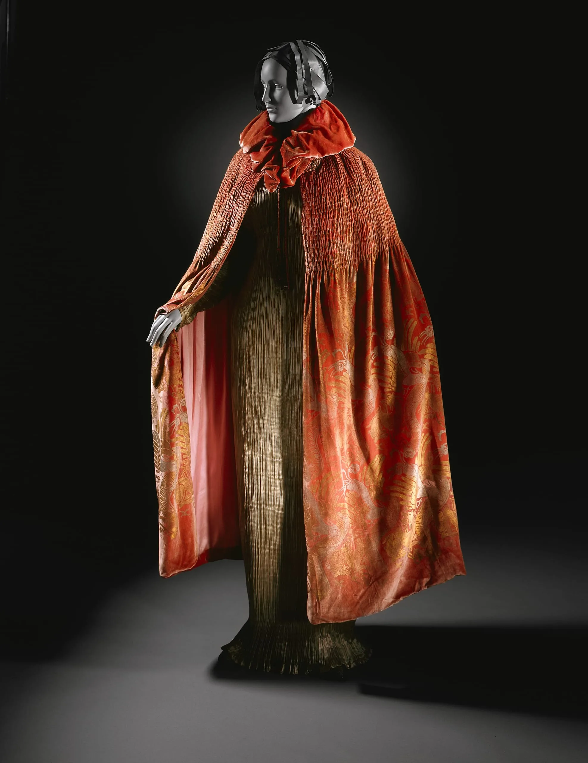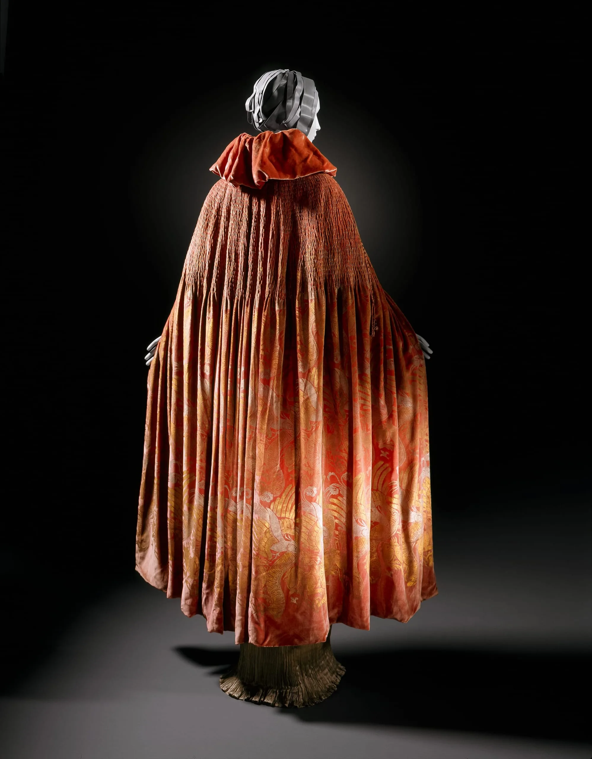 - Silk velvet, printed, with silk and metallic-thread cord and glass beads