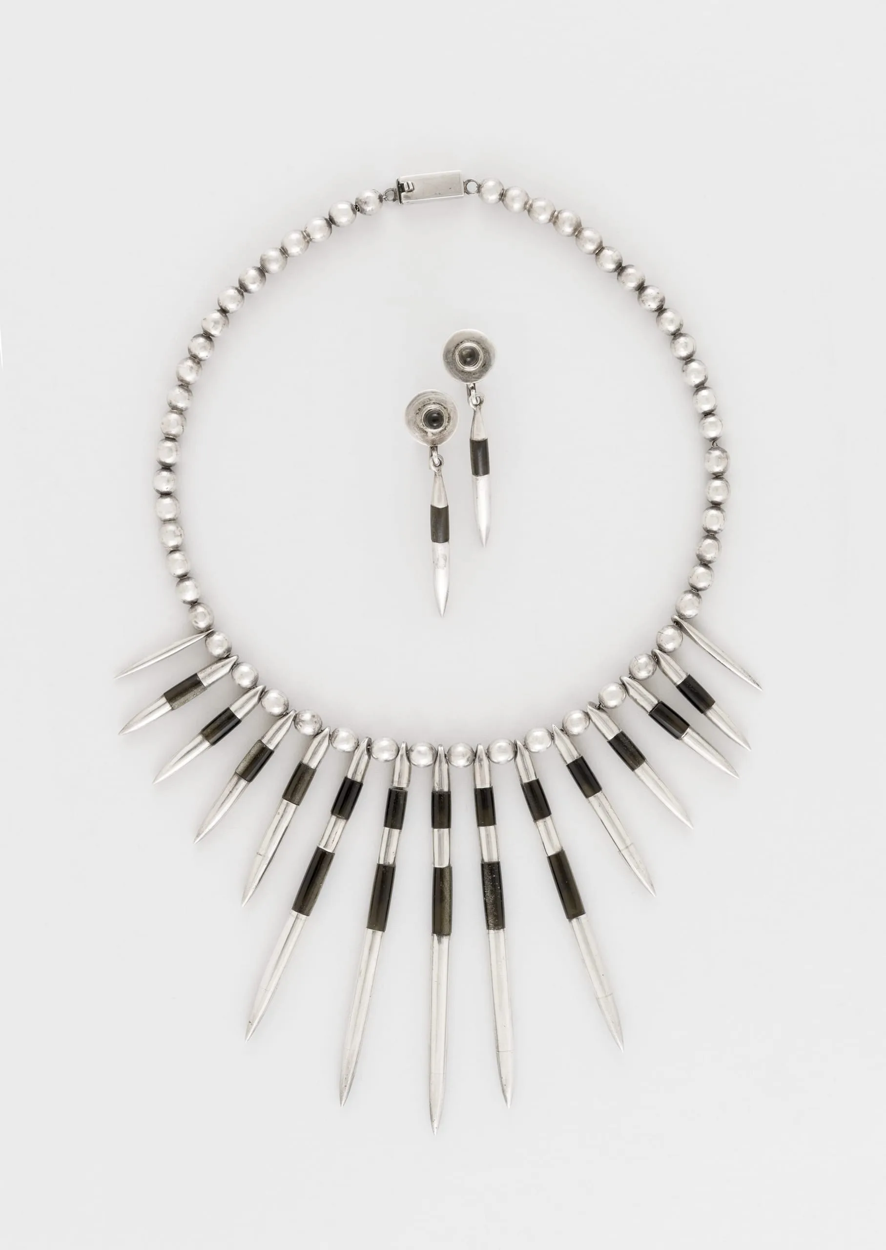 b-c) Earring: 2 × 1/2 × 1 in. (5.08 × 1.27 × 2.54 cm) each