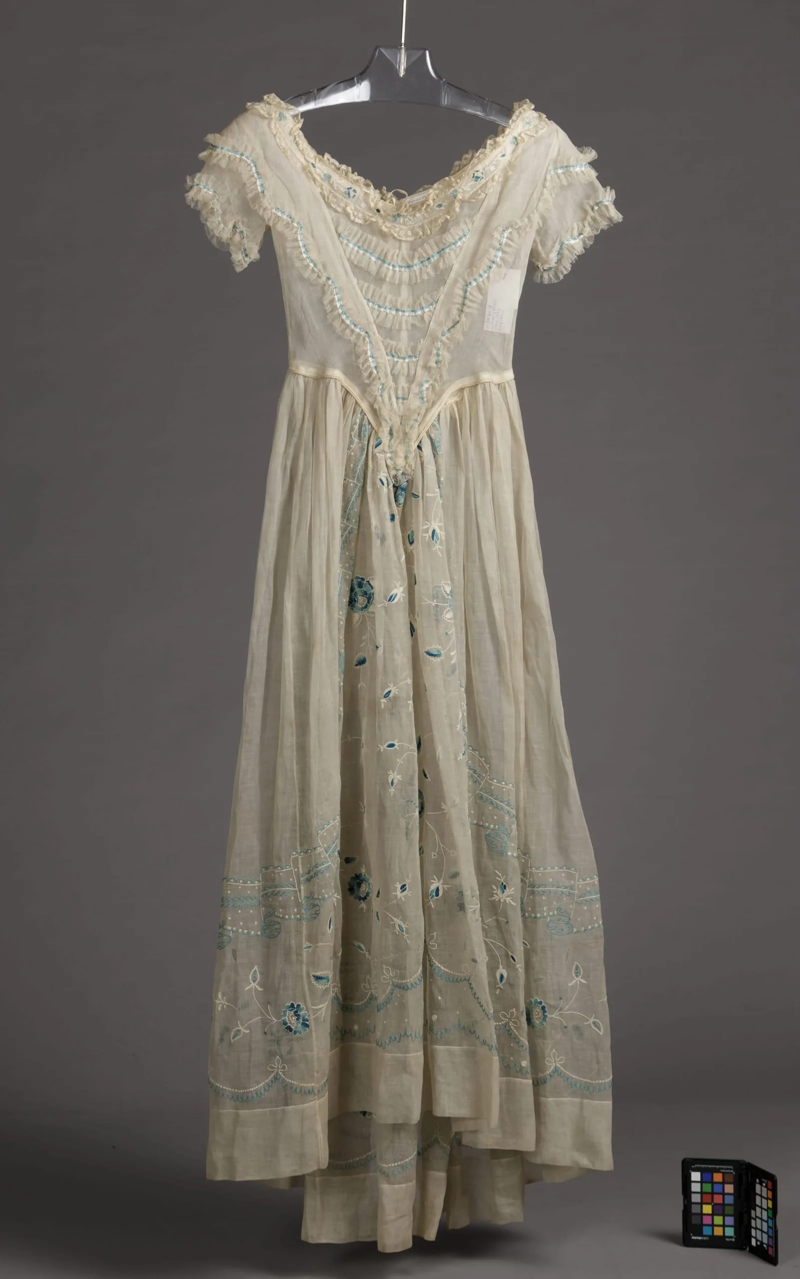 - Cotton plain weave with cotton thread embroidery with silk tulle, silk ribbon, and cotton lace