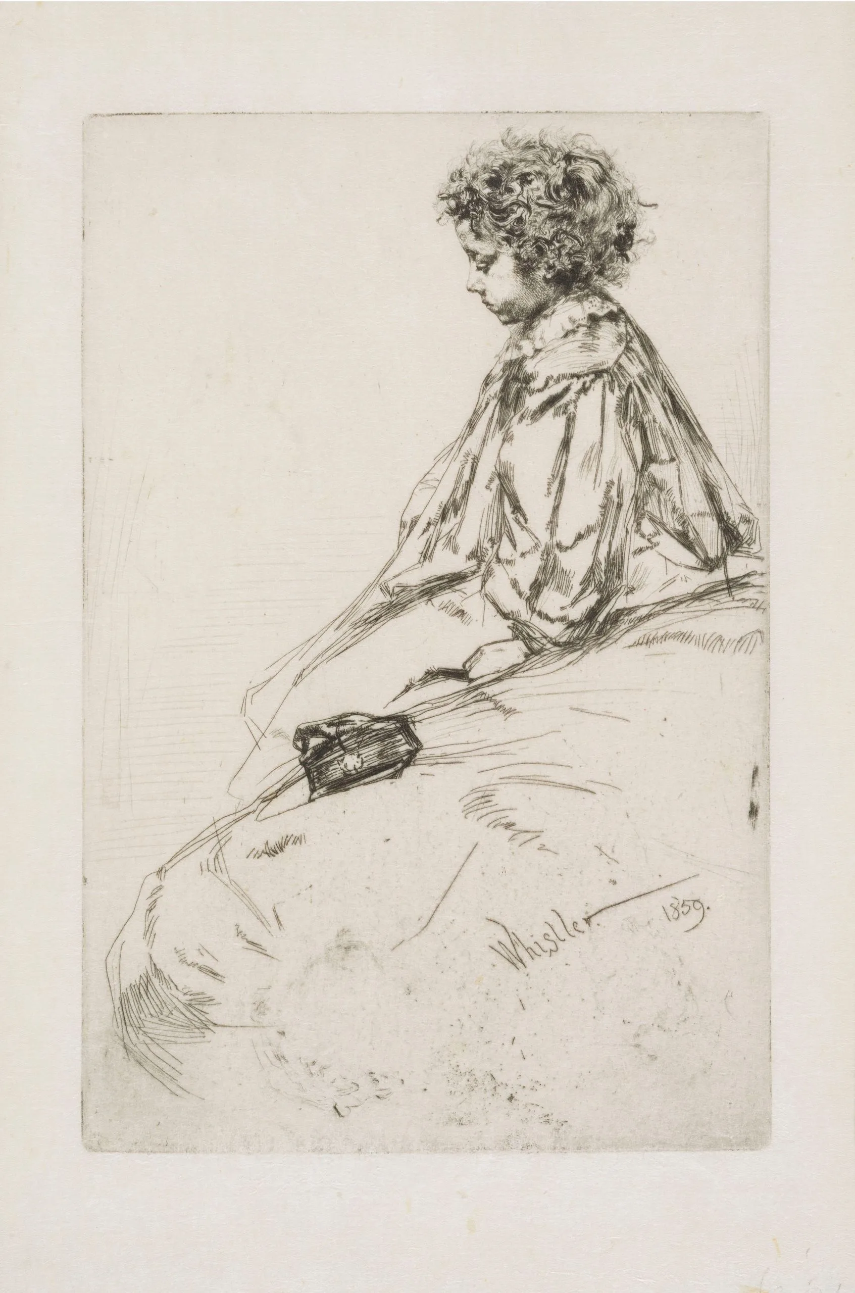 Etching of a young child seated in profile facing left, rendered in loose sketchy lines on cream paper, signed 'Whistler 1859'