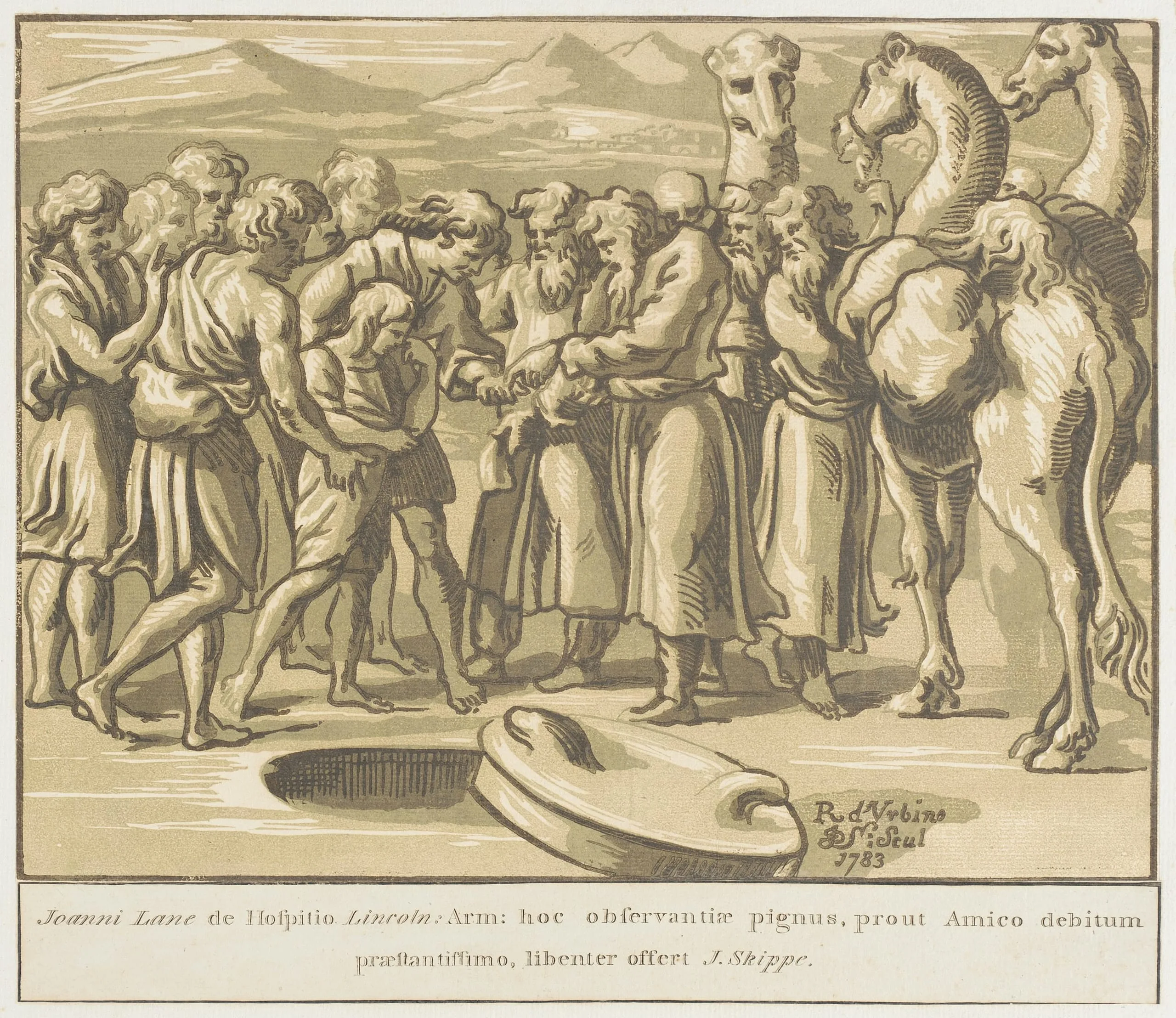 - Chiaroscuro woodcut from three blocks, mounted with an engraved inscription below