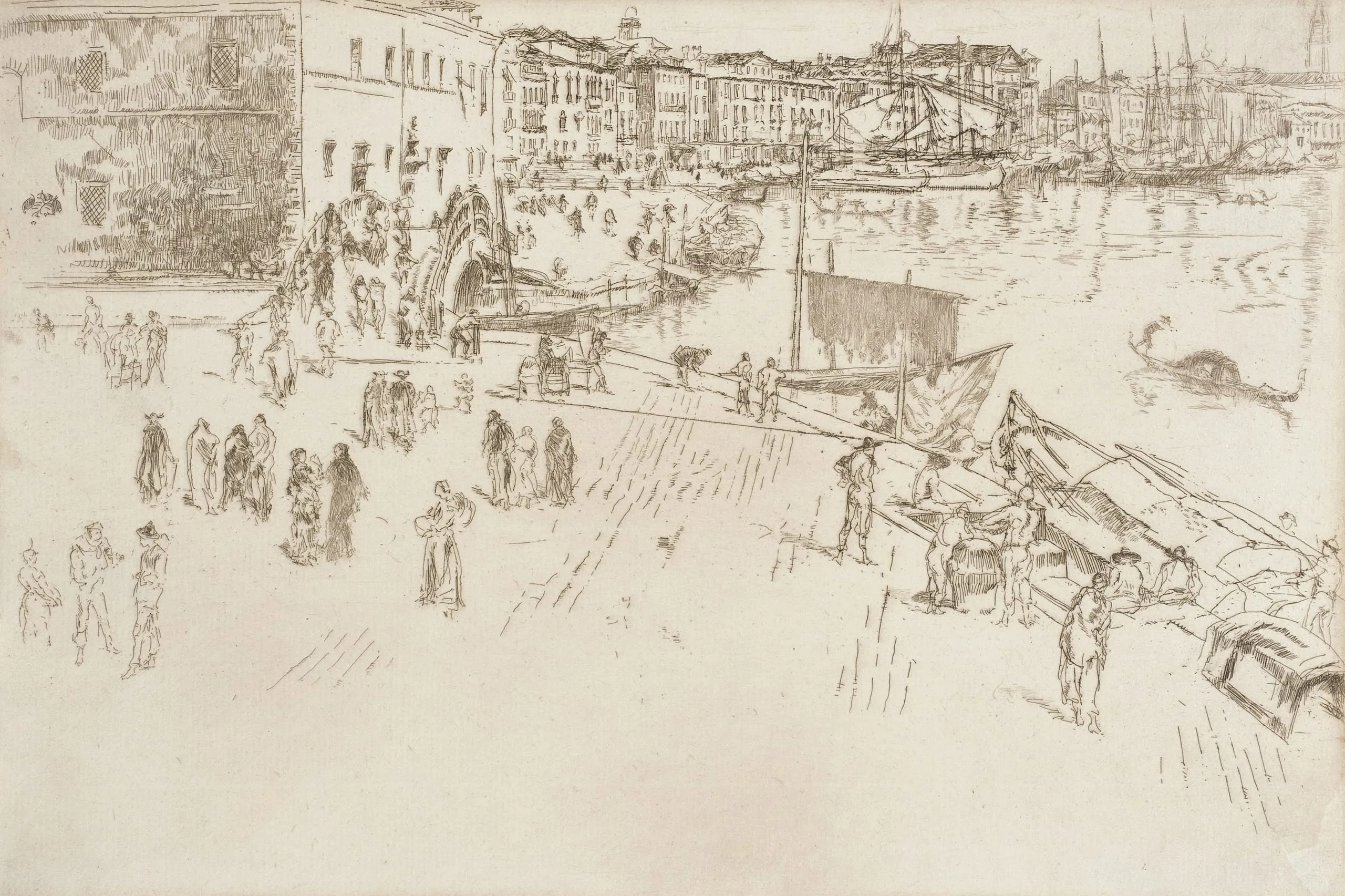 From the summer of 1880, Whistler lived along the Riva degli Schiavoni in an apartment with views of San Giorgio Maggiore and Santa Maria della Salute. Here he portrayed the street scene along the Riva. The etching typifies Whistler’s compositions in which he artfully counterbalanced light and shadow, avoided strong outlines, and used loosely defined spaces, most notably here in the foreground and on the facade of the building at the left.
