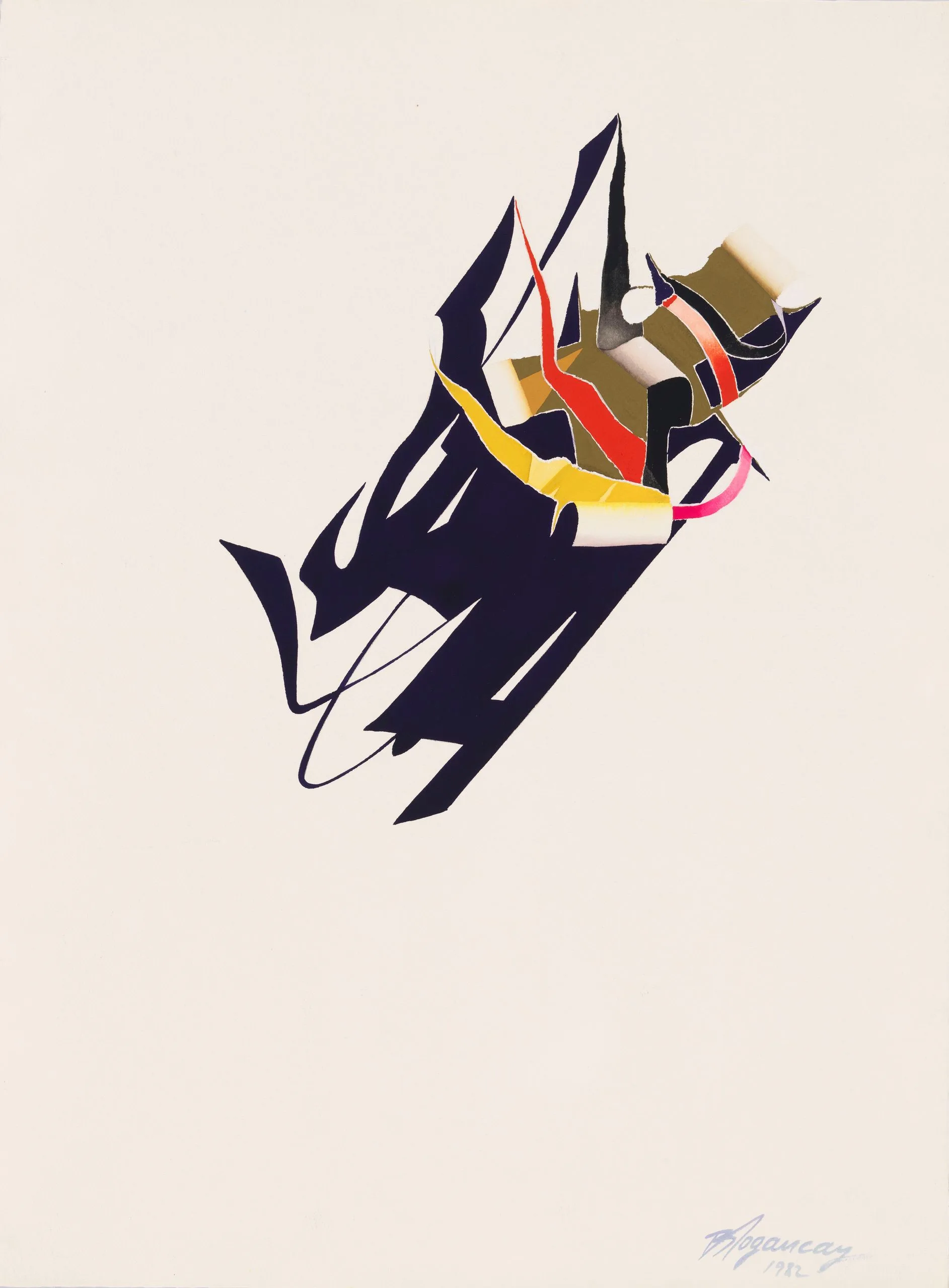 Burhan Doǧançay was one of Turkey’s foremost contemporary artists; he is also well known internationally, particularly for his Urban Walls series, begun in the 1960s. For this series, he traveled worldwide, documenting with his camera city walls covered with curled and mangled advertisements, posters, and graffiti, which he reconstructed into new narratives in his paintings and collages. Doǧançay built on his earlier work in this beautiful pair (see M.2015.160.2) of abstract compositions, in which brightly intense curvilinear forms seem to burst forth from flat, solid-colored backgrounds. Inspired by Islamic calligraphy, the graceful ribbonlike shapes take on a three-dimensional quality, especially as suggested by the implied shadows in the earlier of the two works. Both are from the aptly titled series Ribbons (1972–89).