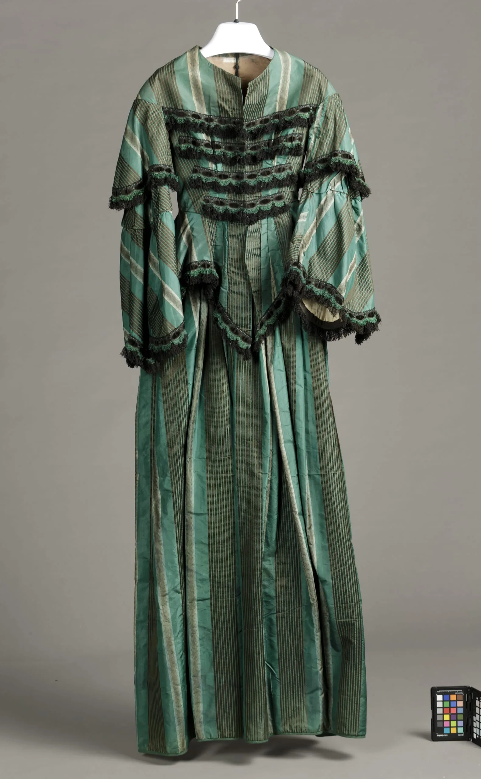- Silk plain weave (taffeta), warp printed, with warp float patterning with silk passementerie