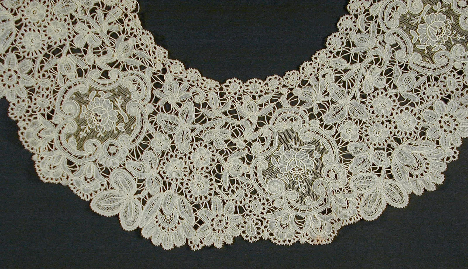 Ivory needle or bobbin lace collar in a crescent shape, densely patterned with floral medallions, scrolling stems, and a scalloped picot border, displayed flat on a dark gray background