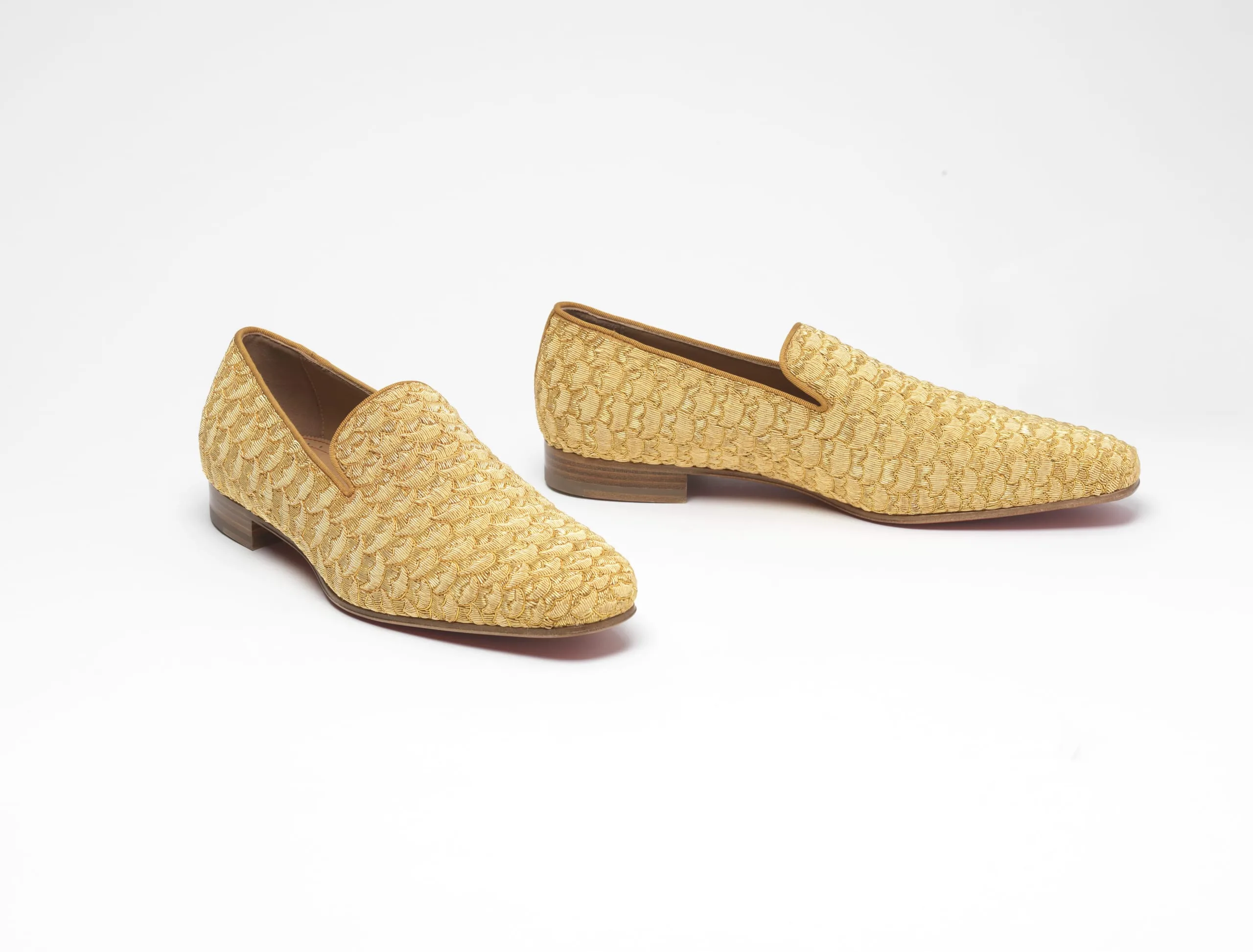 - Linen plain weave (canvas) with gold-metallic-thread embroidery, silk cord trim, and leather