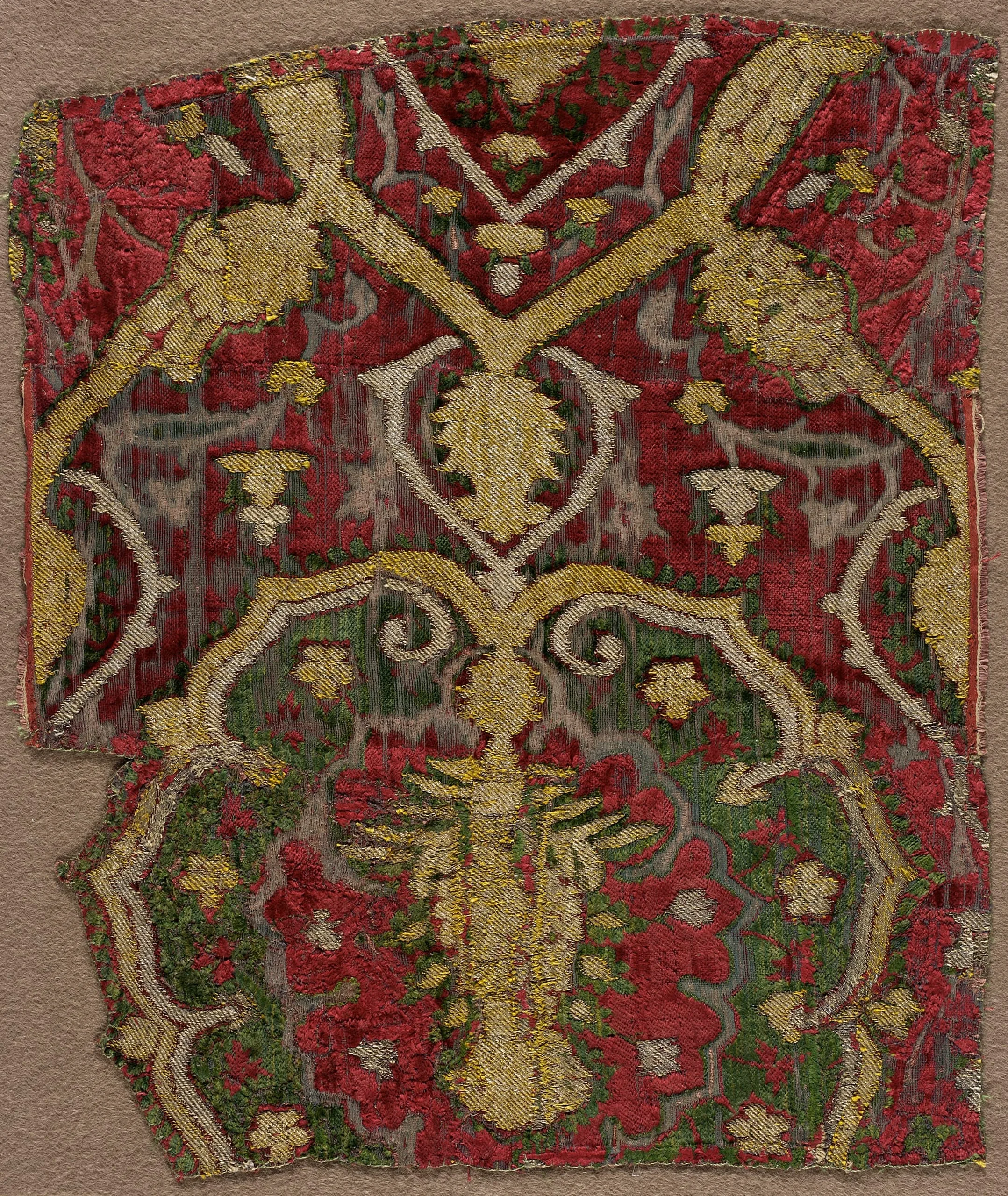 - Silk cut and voided velvet with metallic thread discontinuous supplementary weft patterning (brocade)