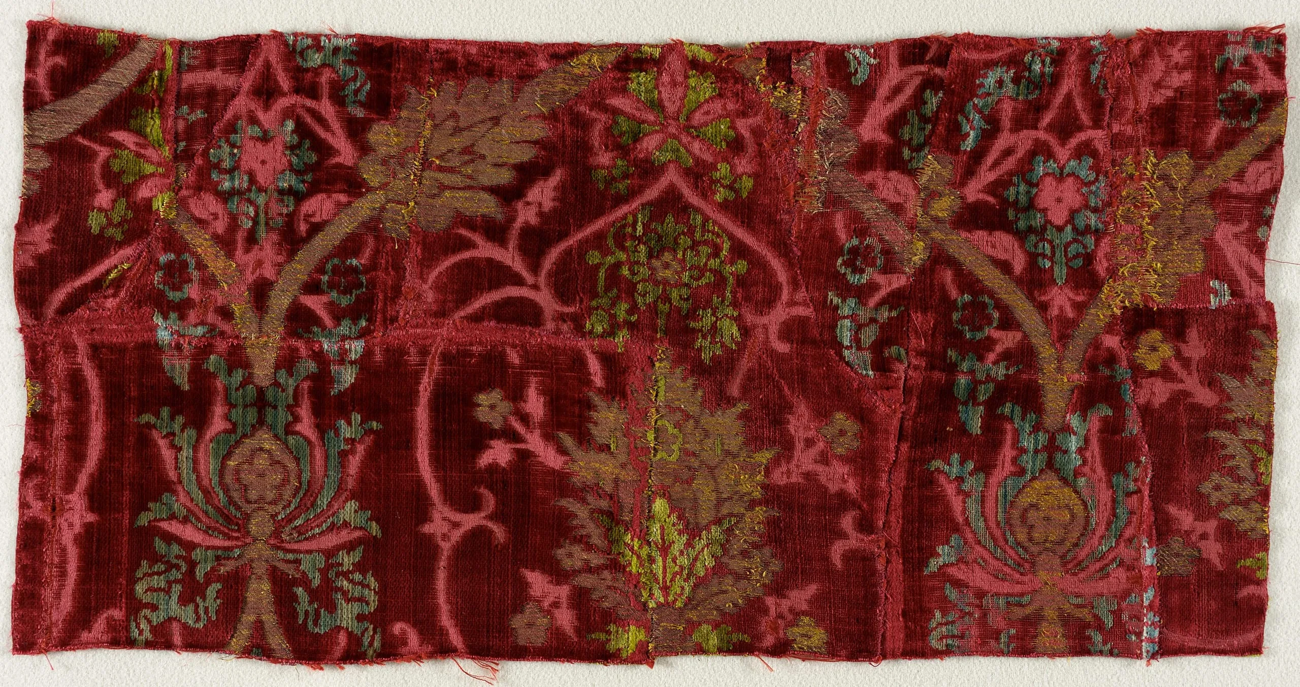 - Silk cut and voided velvet with metallic thread discontinuous supplementary weft patterning (brocade)