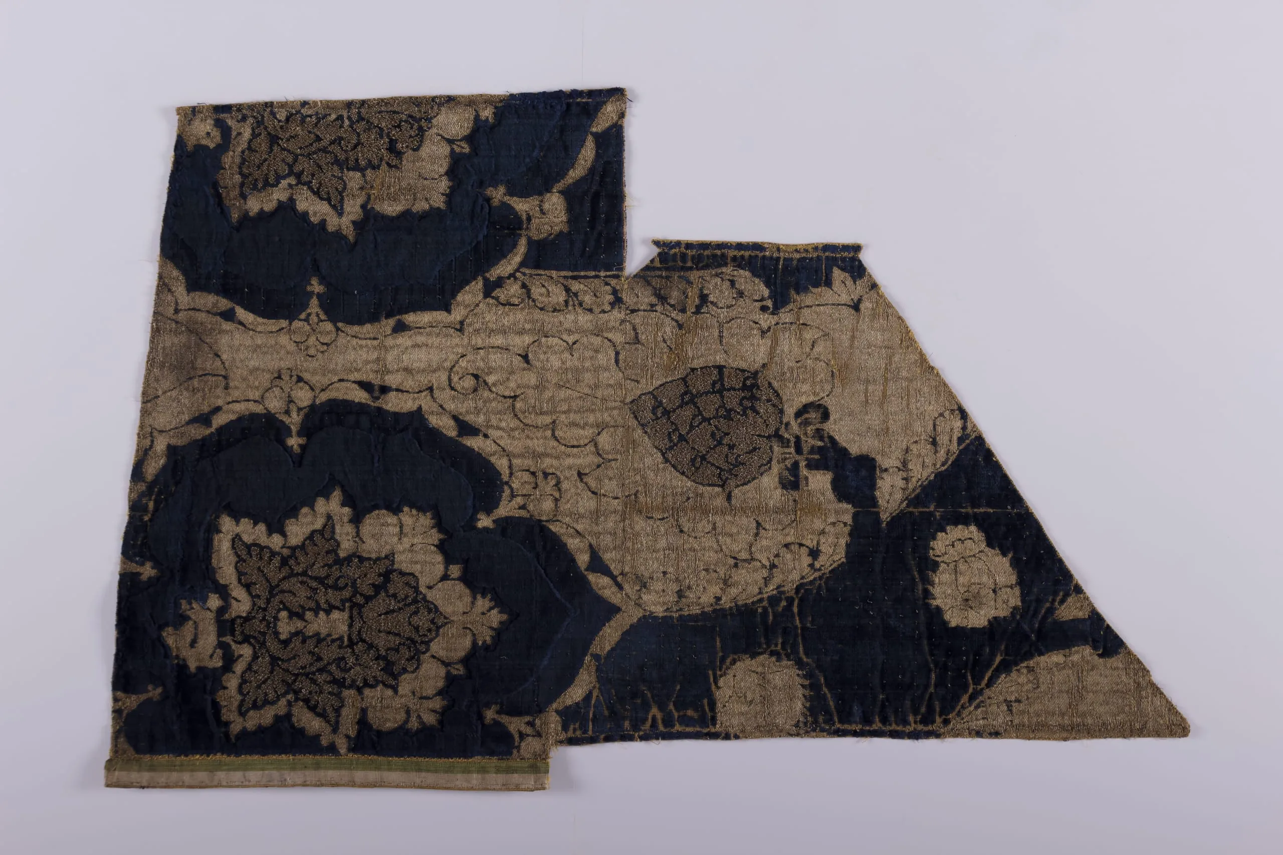 - Silk cut and voided pile-on-pile velvet with metallic-thread supplementary weft-loop (bouclé) and discontinuous supplementary-weft patterning (brocade)