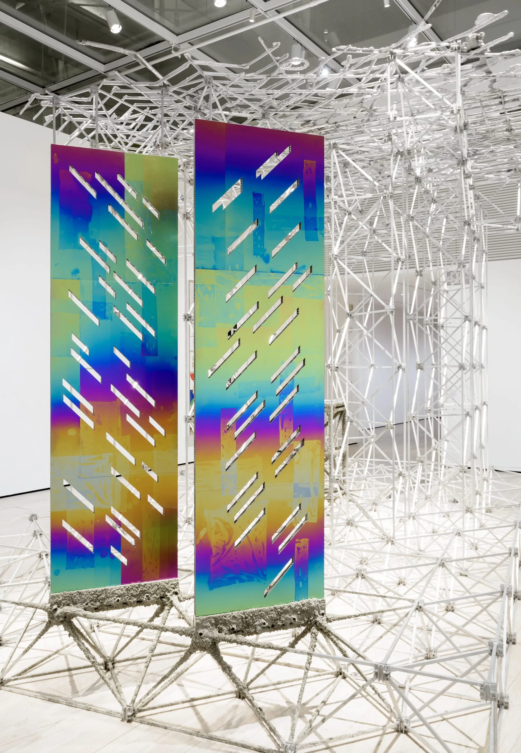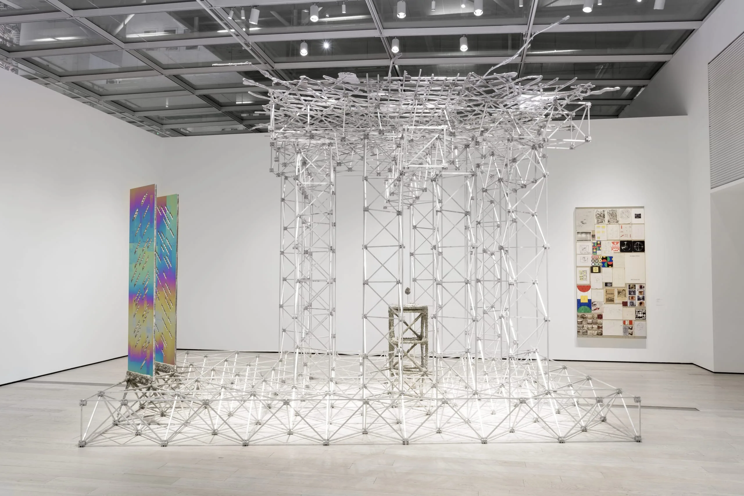 - Aluminum and stainless steel space frame, cast aluminum “thatch” (melted down car rims), anodized and etched titanium sheeting on aluminum honeycomb panels, Neanderthal hand axe, and sprayed papercrete