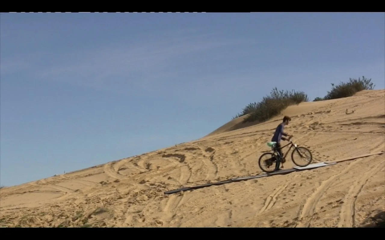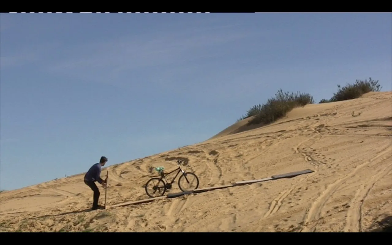 This sweetly absurd video records a young man attempting to cross a sand dune on a bicycle. The difficulty and preposterousness of his task become apparent as he rides along a set of boards that pave his path for a short distance. Then he must stop to move the boards, creating another brief stretch of passable ground, only to begin again. His laborious journey—of unknown purpose and destination—is simultaneously frustrating and humorous, bringing to mind both Sisyphus and Buster Keaton and serving perhaps as a universal metaphor for any seemingly insurmountable undertaking. For the creator of the video, Elham Rokni, it has a more personal meaning pertaining to her own physical challenges.