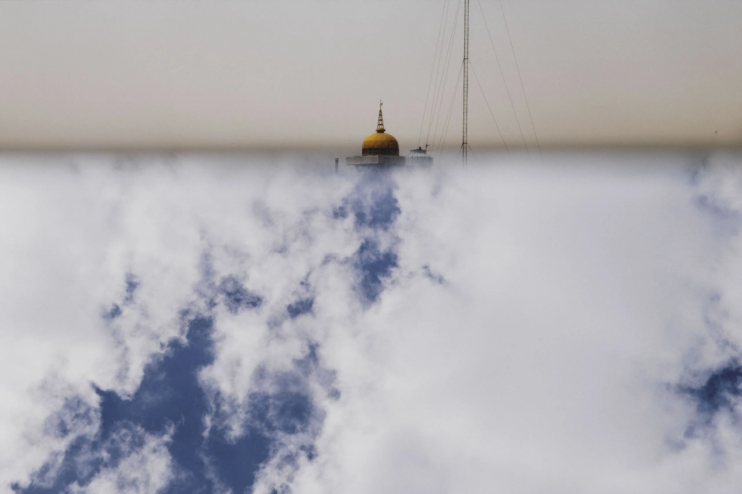 These arresting images (see M.2015.18.1-.5) of the Tehran skyline are part of a larger project by Dadbeh Bassir documenting the city’s ever-changing and expanding urban landscape. As with much of his work, which employs physical manipulation, the photographer here constructs a disorienting and dreamlike environment by placing a mirror perpendicular to his camera lens. In Bassir's metaphoric cityscapes, skyscrapers and urban sprawl are cut off abruptly by clouds and mountaintops that incongruously descend from an ambiguous horizon line. This composite imagery reverses the familiar hierarchy between the natural and the built environments, the former asserting itself over the earthbound megalopolis by dominating the composition and creating a new, seemingly celestial city.