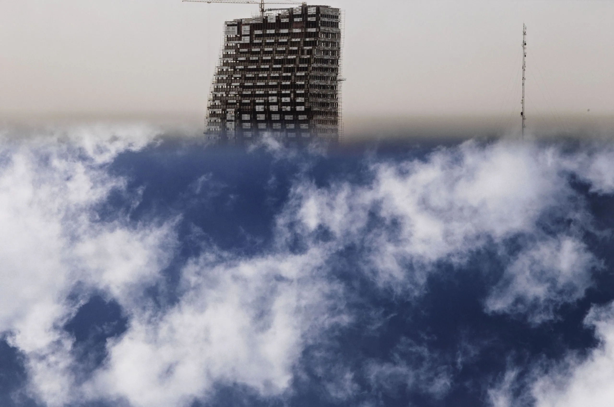 These arresting images (see M.2015.18.1-.5) of the Tehran skyline are part of a larger project by Dadbeh Bassir documenting the city’s ever-changing and expanding urban landscape. As with much of his work, which employs physical manipulation, the photographer here constructs a disorienting and dreamlike environment by placing a mirror perpendicular to his camera lens. In Bassir's metaphoric cityscapes, skyscrapers and urban sprawl are cut off abruptly by clouds and mountaintops that incongruously descend from an ambiguous horizon line. This composite imagery reverses the familiar hierarchy between the natural and the built environments, the former asserting itself over the earthbound megalopolis by dominating the composition and creating a new, seemingly celestial city.