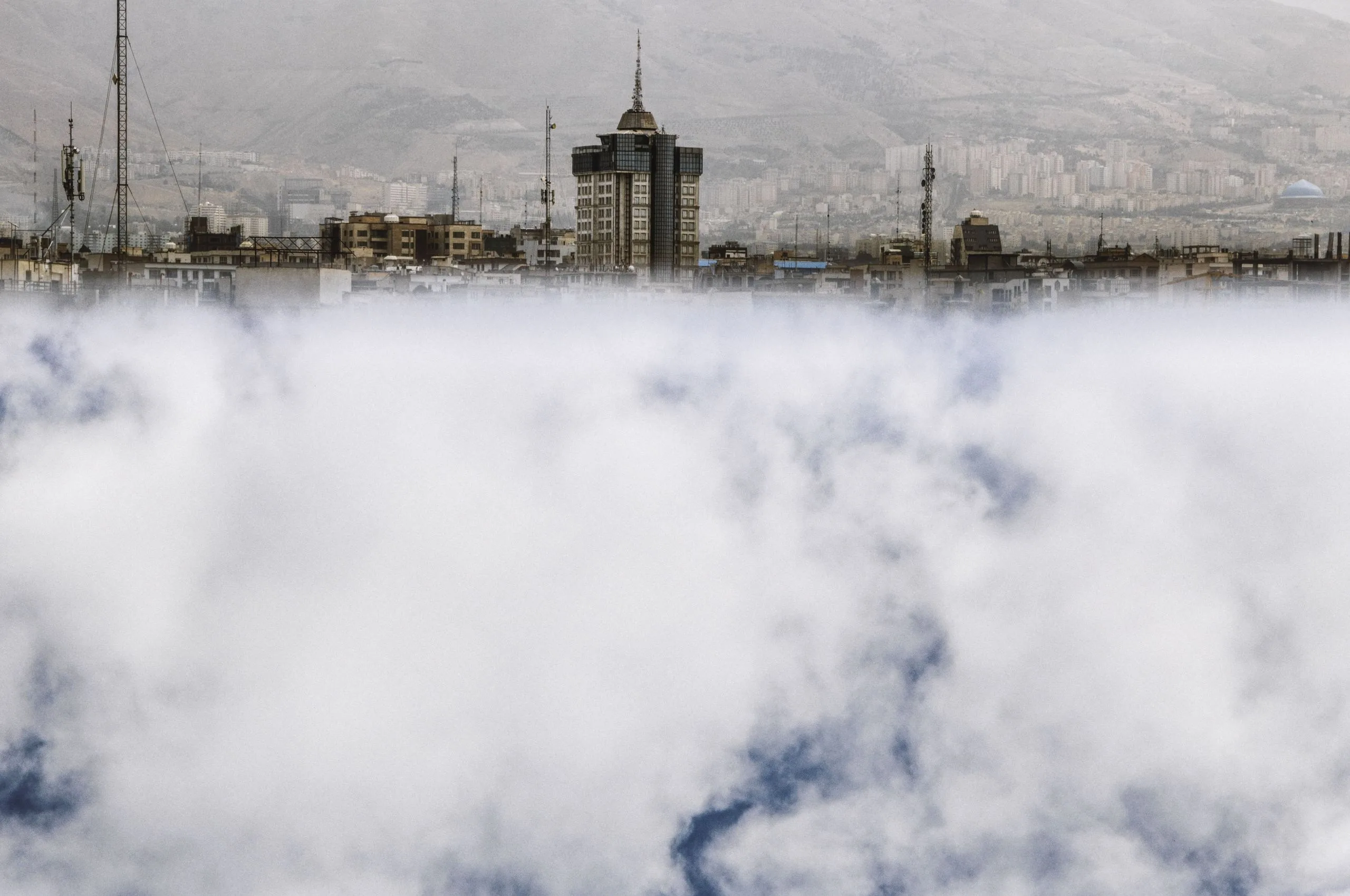 These arresting images (see M.2015.18.1-.5) of the Tehran skyline are part of a larger project by Dadbeh Bassir documenting the city’s ever-changing and expanding urban landscape. As with much of his work, which employs physical manipulation, the photographer here constructs a disorienting and dreamlike environment by placing a mirror perpendicular to his camera lens. In Bassir's metaphoric cityscapes, skyscrapers and urban sprawl are cut off abruptly by clouds and mountaintops that incongruously descend from an ambiguous horizon line. This composite imagery reverses the familiar hierarchy between the natural and the built environments, the former asserting itself over the earthbound megalopolis by dominating the composition and creating a new, seemingly celestial city.