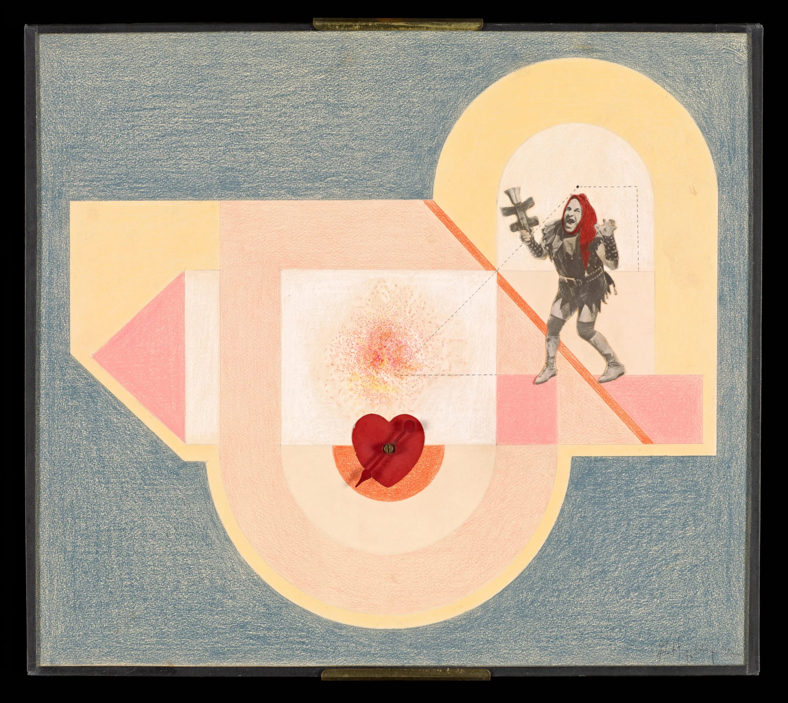- Collage: paper, colored pencil, found image, sticker, plastic arrow
