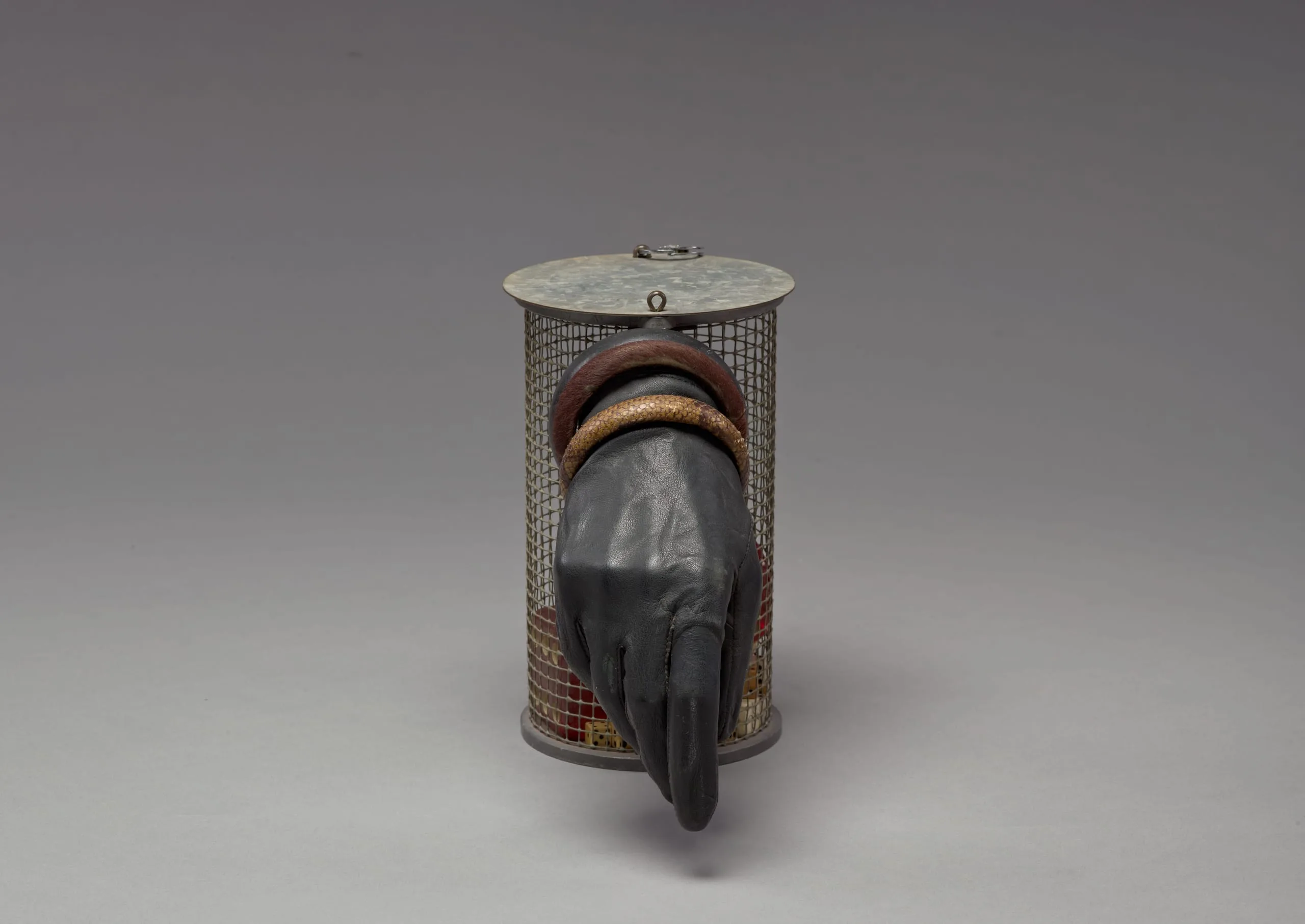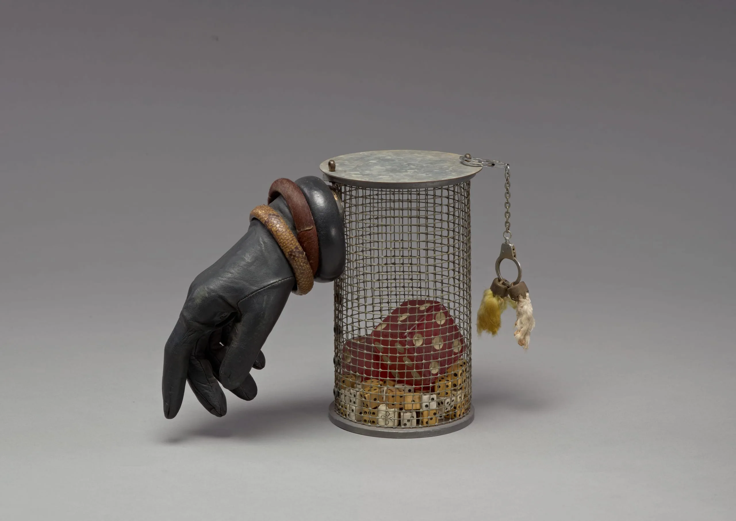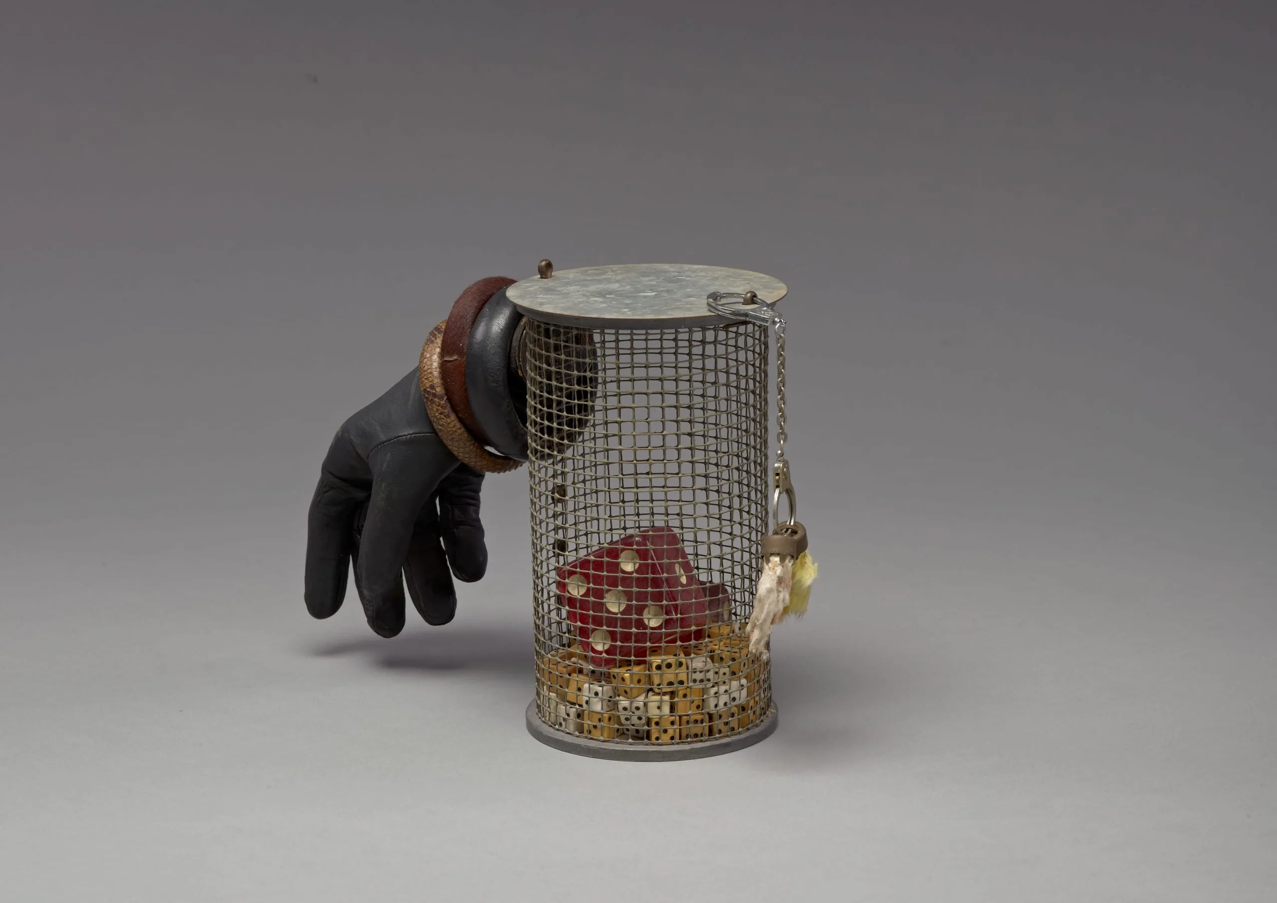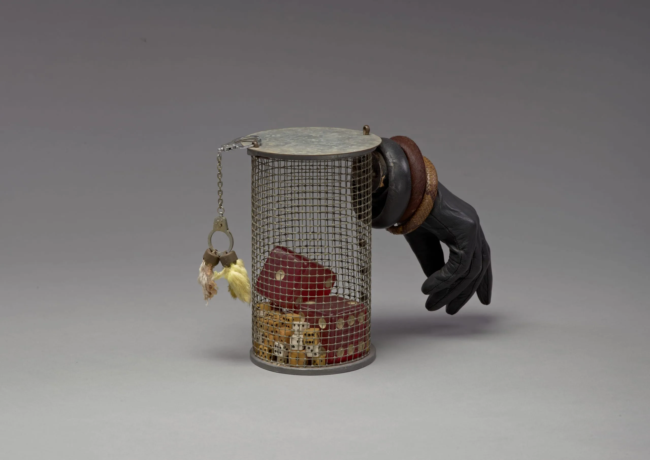 - Zinc cage, plastic dice, leather glove on mannequin hand, cowhide bracelets, rabbit’s foot