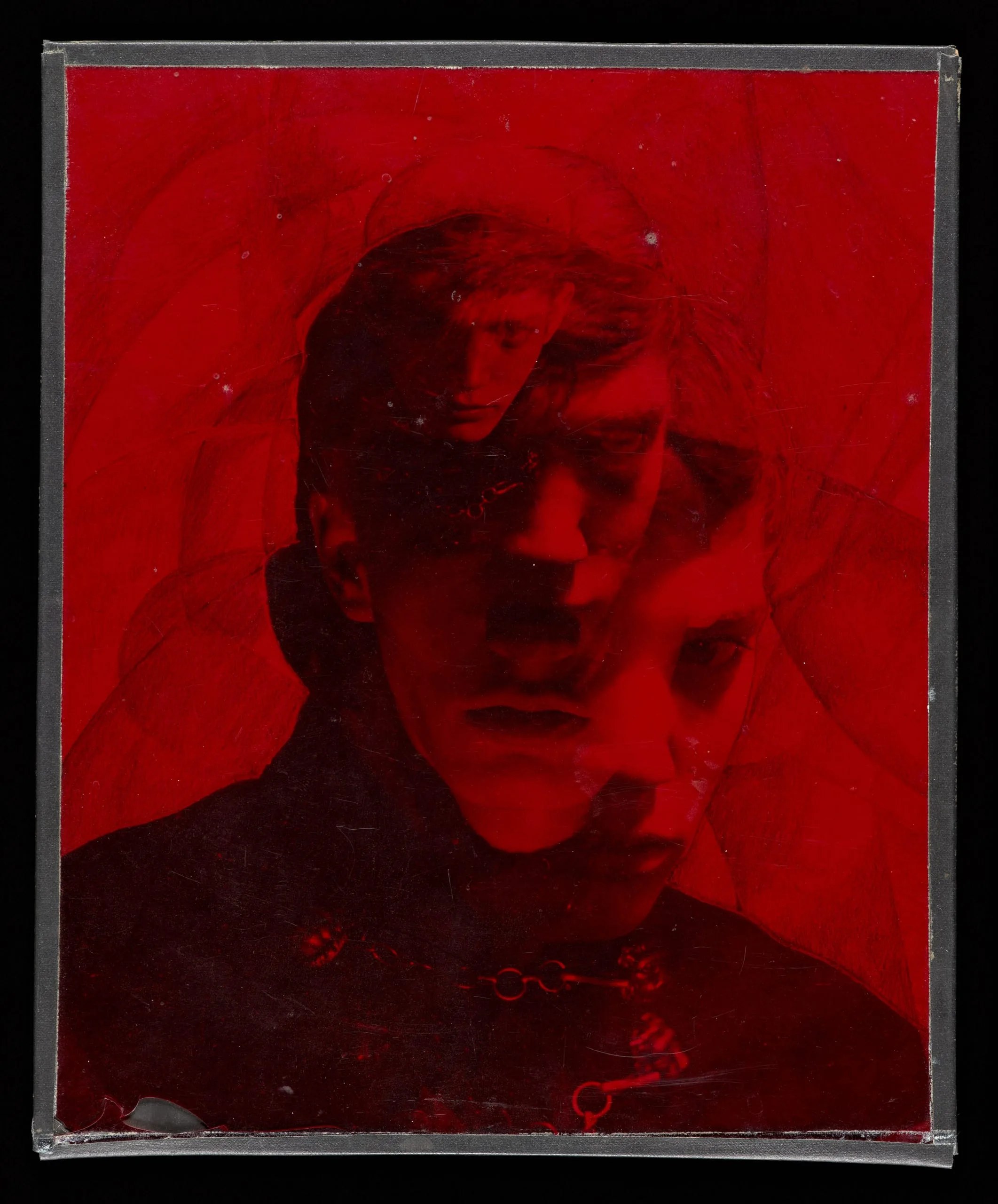 - Gelatin silver print, graphite, transparent red plastic, tape