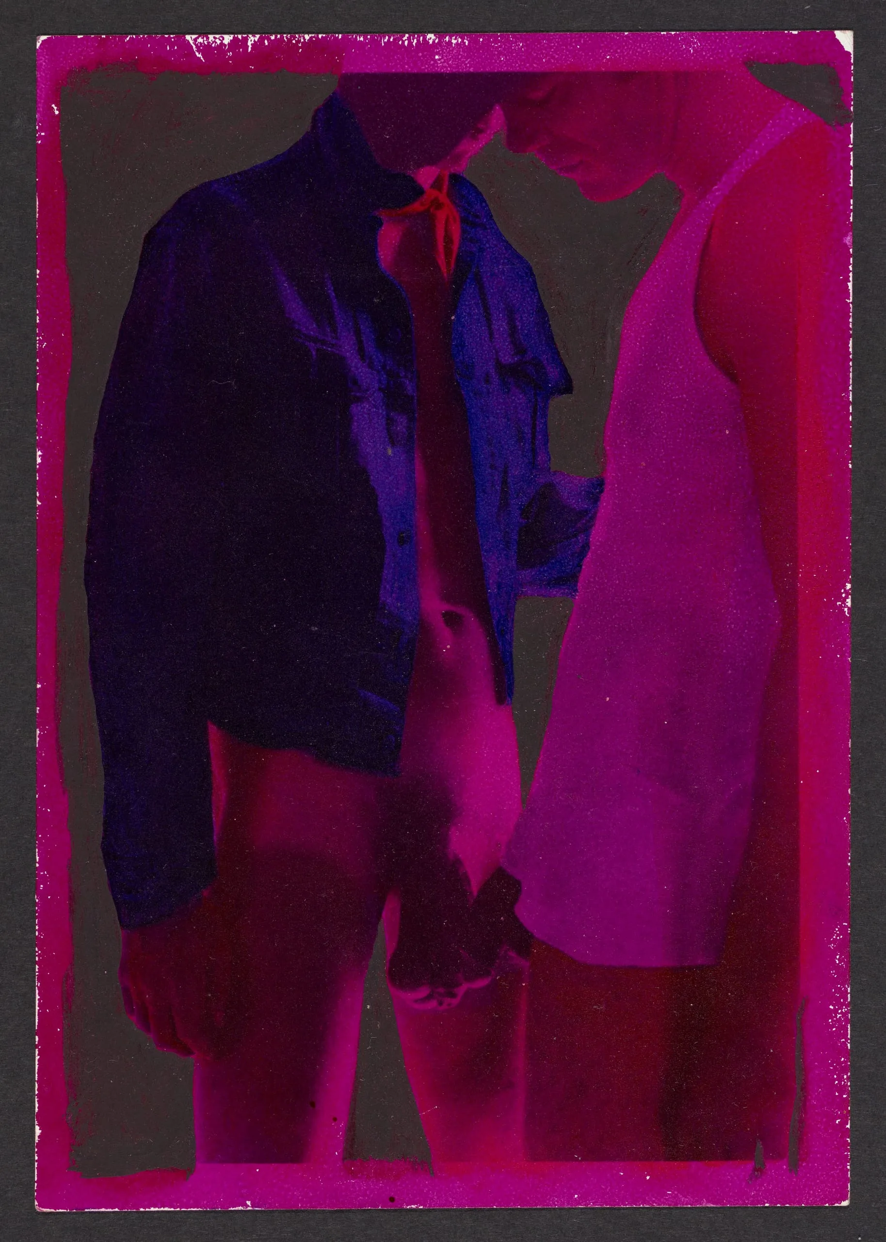 Color-manipulated photograph, two figures in violet and magenta tones standing close together, heads tilted toward each other, hands clasped, with a vivid pink border