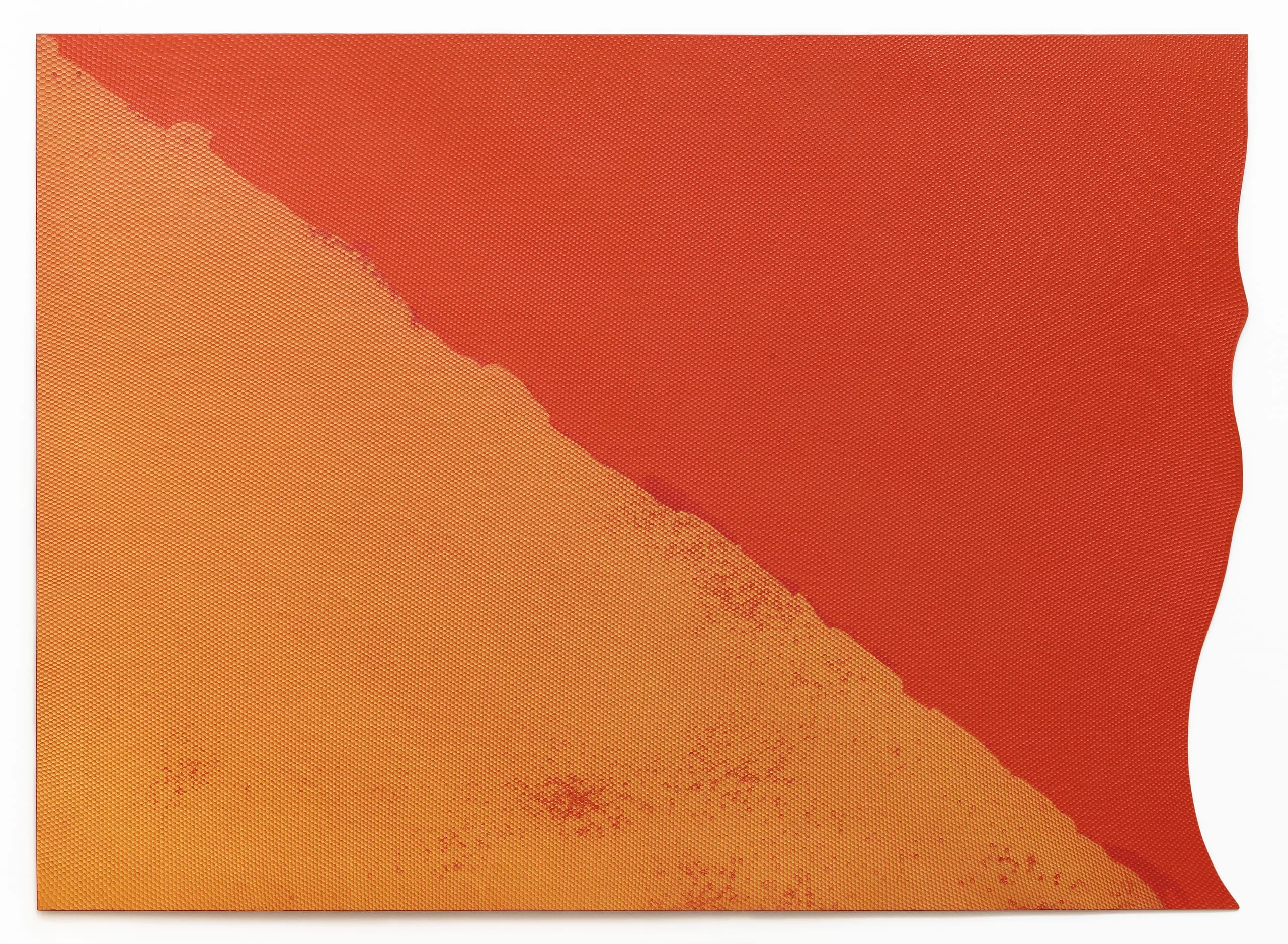 Southern California artist Roland Reiss is best known for his miniature dioramas and flower paintings, but Red Edge marks an earlier, transformative period during which he was directly engaging and questioning contemporary artistic idioms. Reiss began working with plastics in the early 1960s to, in his words, “move away from the brushstrokes, paint, and canvas of the Abstract Expressionists....The technical elements of painting could be replaced with new surfaces, colors, textures, reflectivities, and physical strength.” Red Edge is one of a series of works he created by making latex molds of ceiling panels used to diffuse fluorescent lights, then spraying the molds with polyester resin and backing them with fiberglass. The resulting honeycomb-textured surface both reflects light, due to the use of industrial paint, and lends itself to a perception of gradated color, depending on how light hits the beveled edges of each cell.