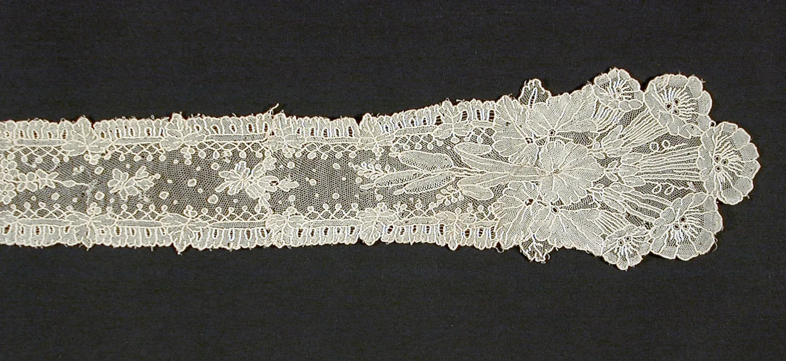 Horizontal strip of cream-colored lace with a mesh ground, scattered floral motifs, and a flared scalloped terminal at the right end, displayed on black