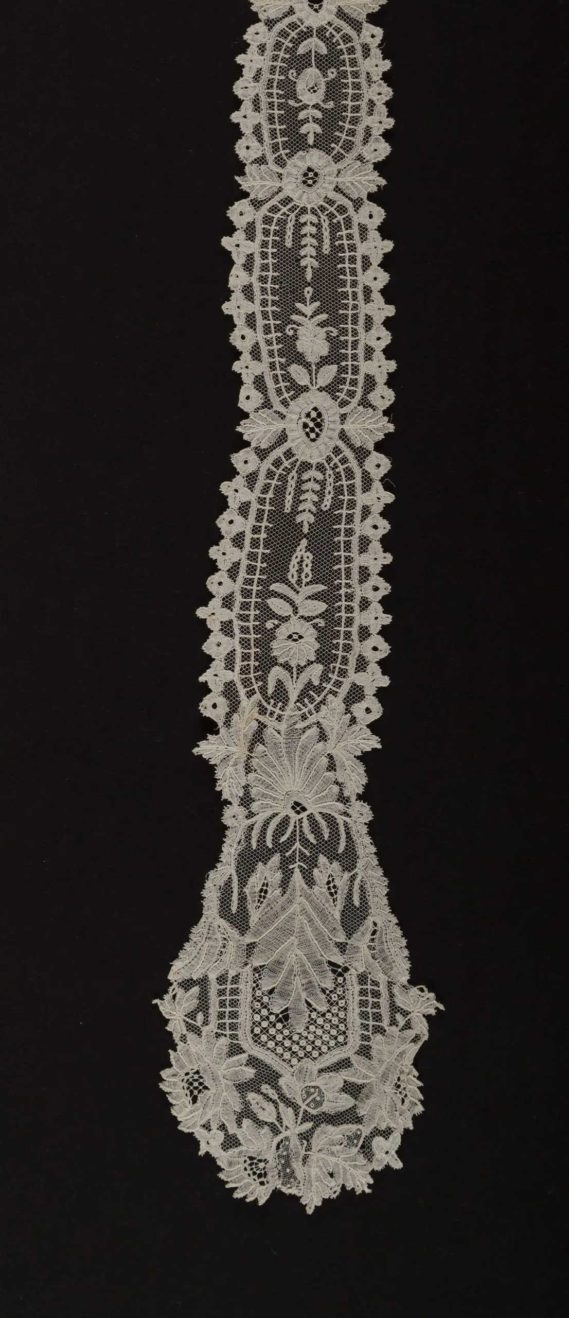 Vertical strip of cream needle lace with repeating floral cartouches, serrated edges, fine mesh ground, and a pointed lower end with fan and floral motifs, against a black background