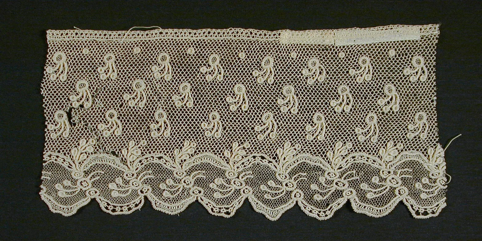 Horizontal strip of cream-colored bobbin lace with scattered paisley motifs on a fine net ground above a scalloped border of dense floral and foliate patterns