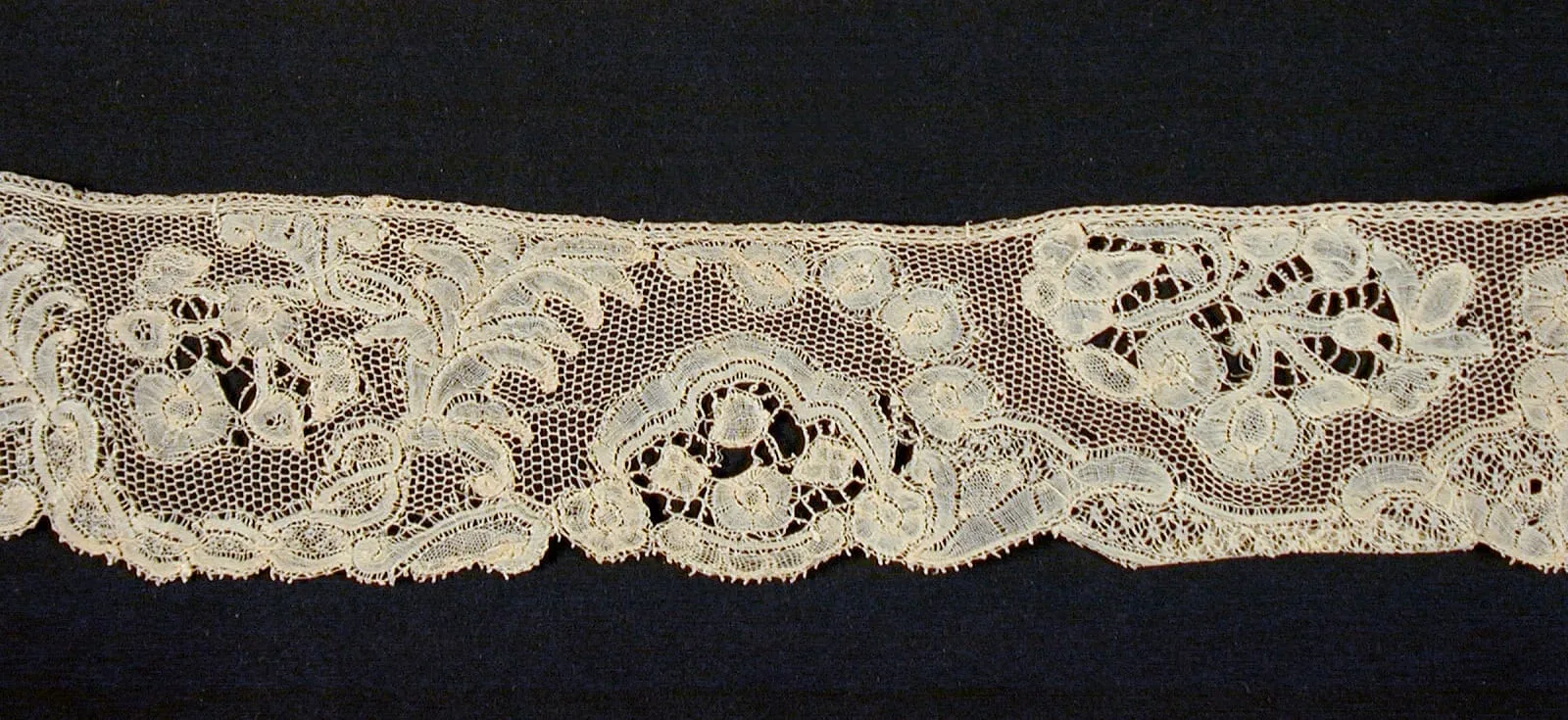 Strip of cream-colored bobbin or needle lace with repeating floral clusters, curling stems, and scalloped lower edge against a black background