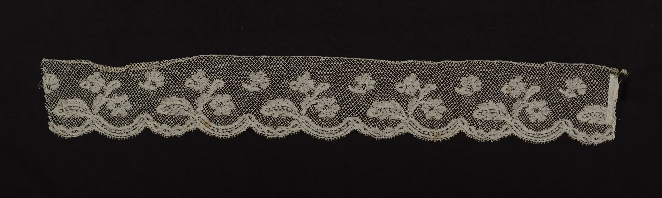 Horizontal strip of cream needle lace with diamond-mesh ground, repeating five-petaled floral motifs on a winding stem, and a scalloped lower edge