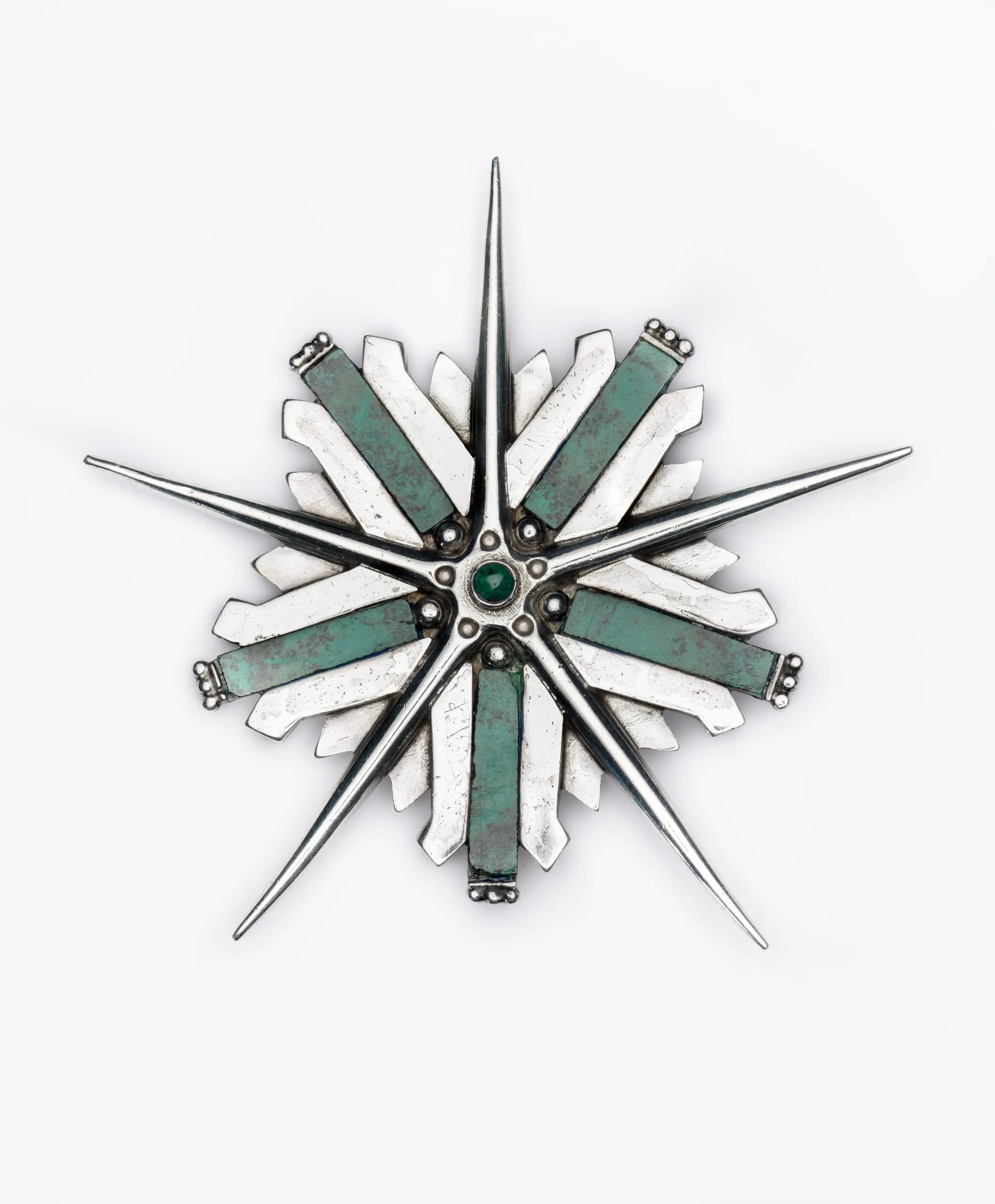 Silver star-shaped brooch with eight radiating spikes, seafoam green enameled panels, granule accents, and a central emerald green cabochon stone