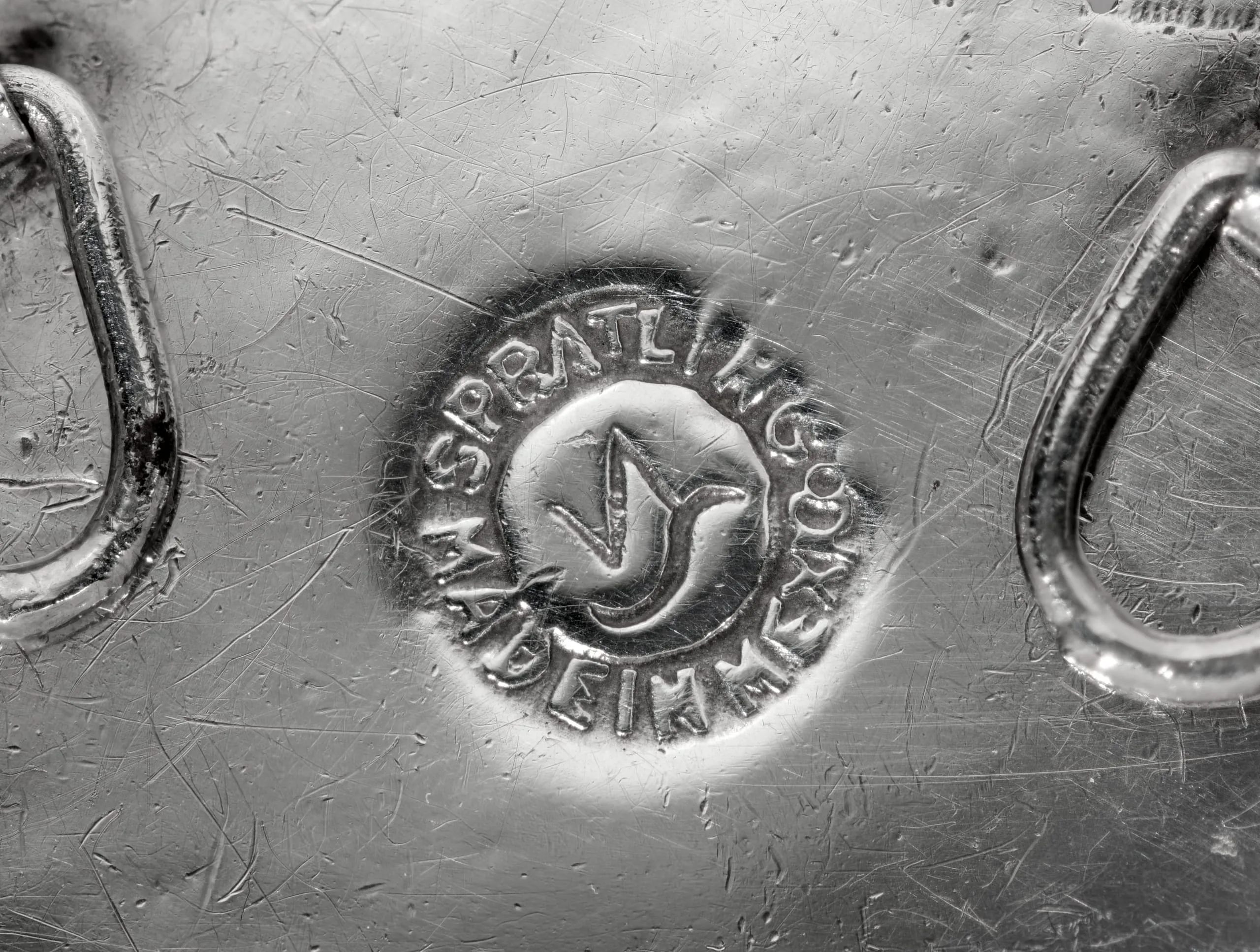 Close-up black and white photograph of a silver maker's mark stamp reading "SPRATLING / MADE IN MEXICO" in a circular border surrounding a raised bird motif, on a scratched metal surface.