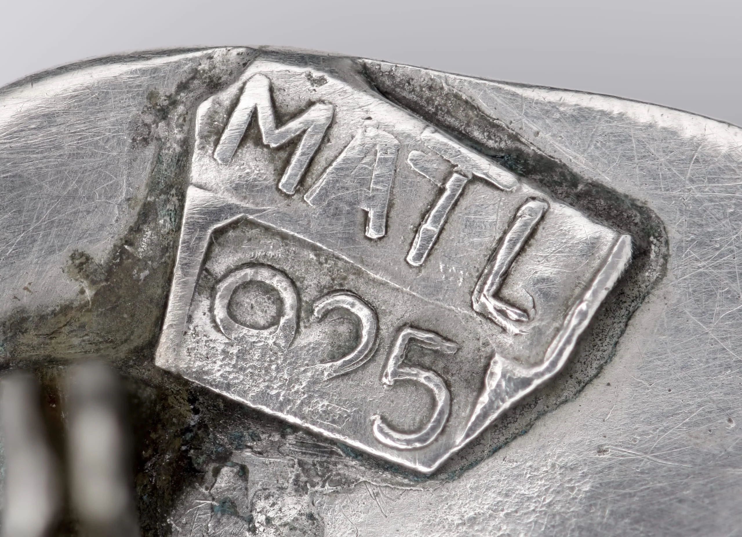 Close-up photograph of a silver maker's mark stamp reading "MATL" above "925" within a raised rectangular cartouche on a scratched silver surface.
