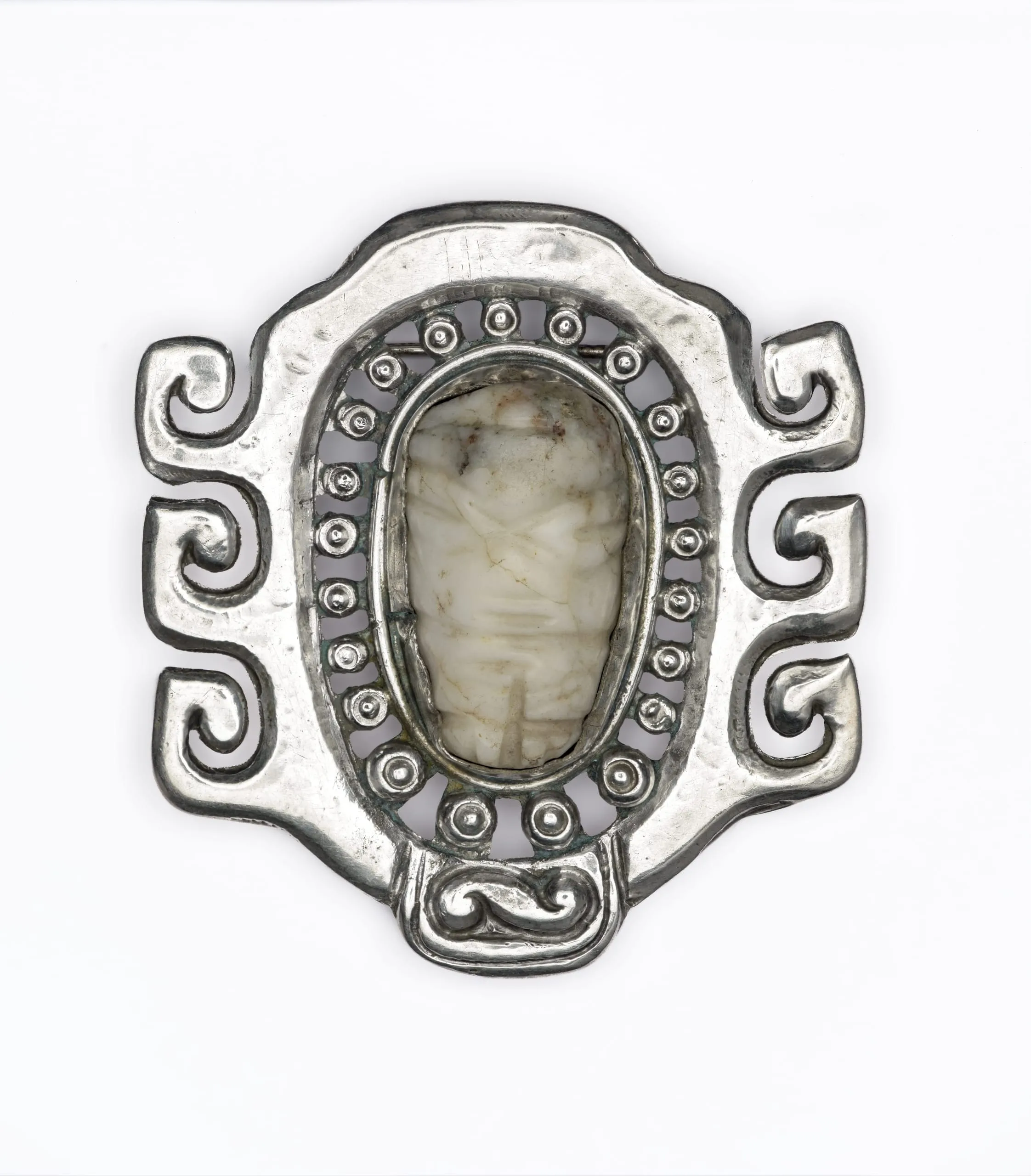Silver metal decorative object with shield-like form, central oval white stone cabochon surrounded by beaded bezel, and bold scroll ornaments at sides and lower edge