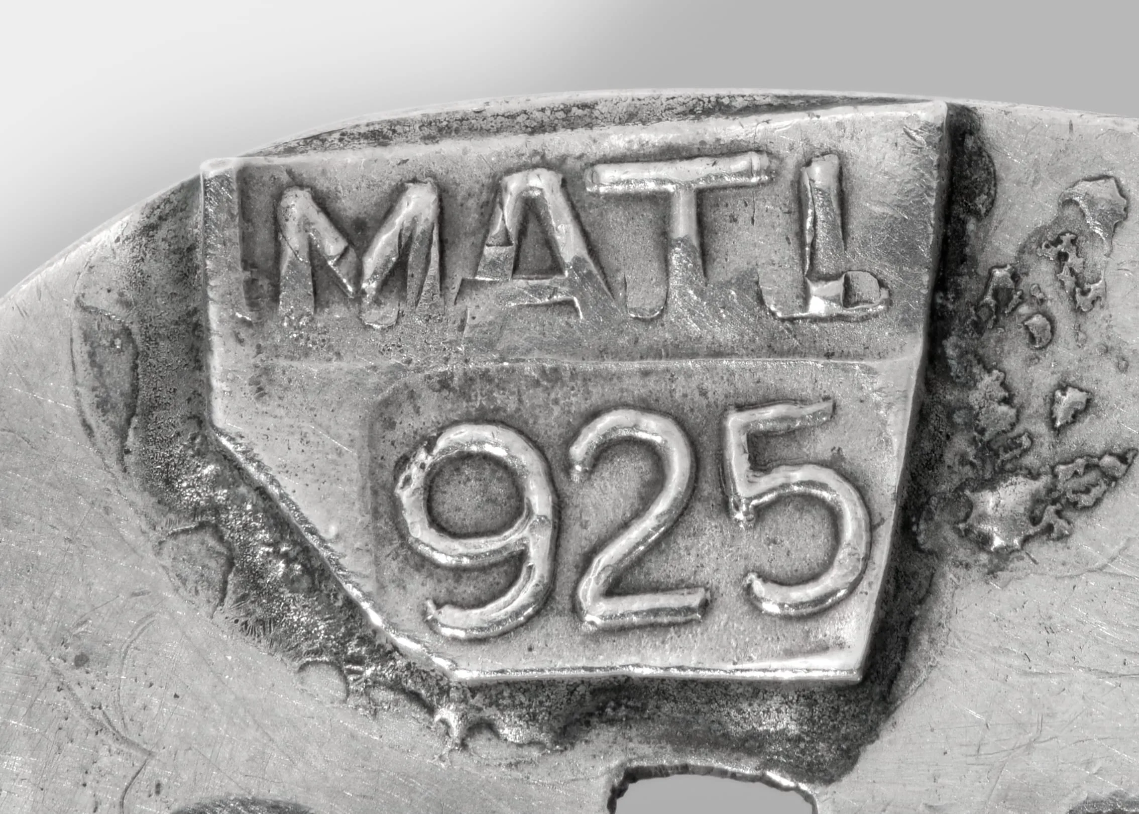 Close-up black and white photograph of a silver hallmark stamp showing raised Cyrillic text and the numerals 925, indicating sterling silver purity, with visible surface texture and casting marks.