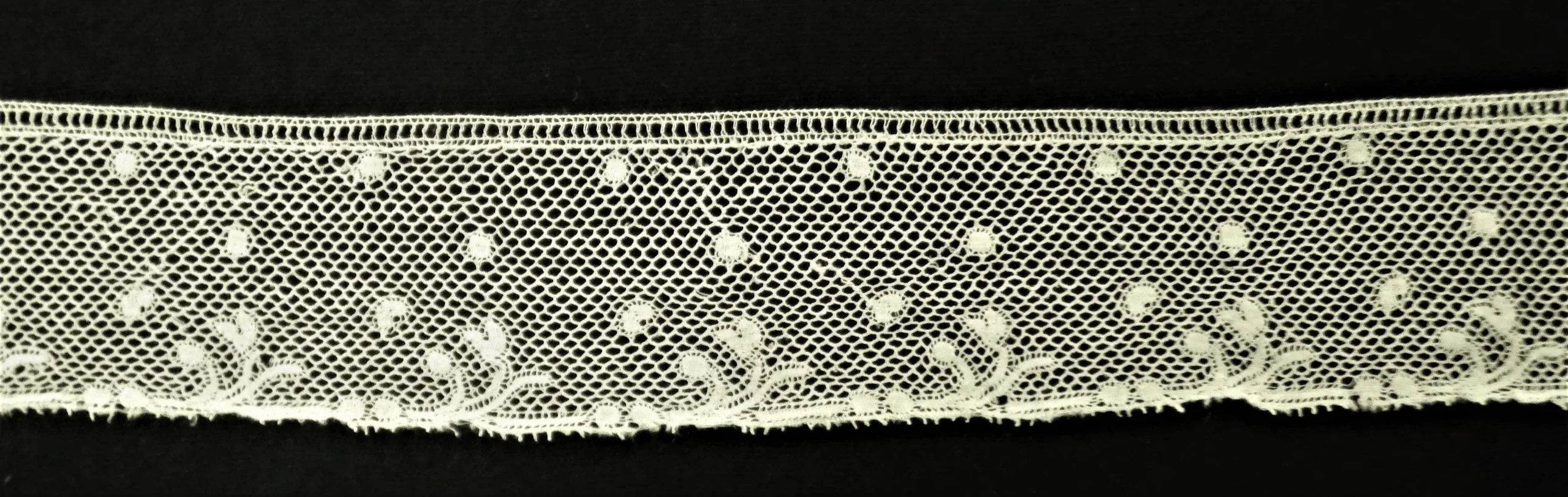 Horizontal strip of ivory net lace with a scrolling leaf border along the lower edge and scattered raised dots across the mesh field, photographed against a black background