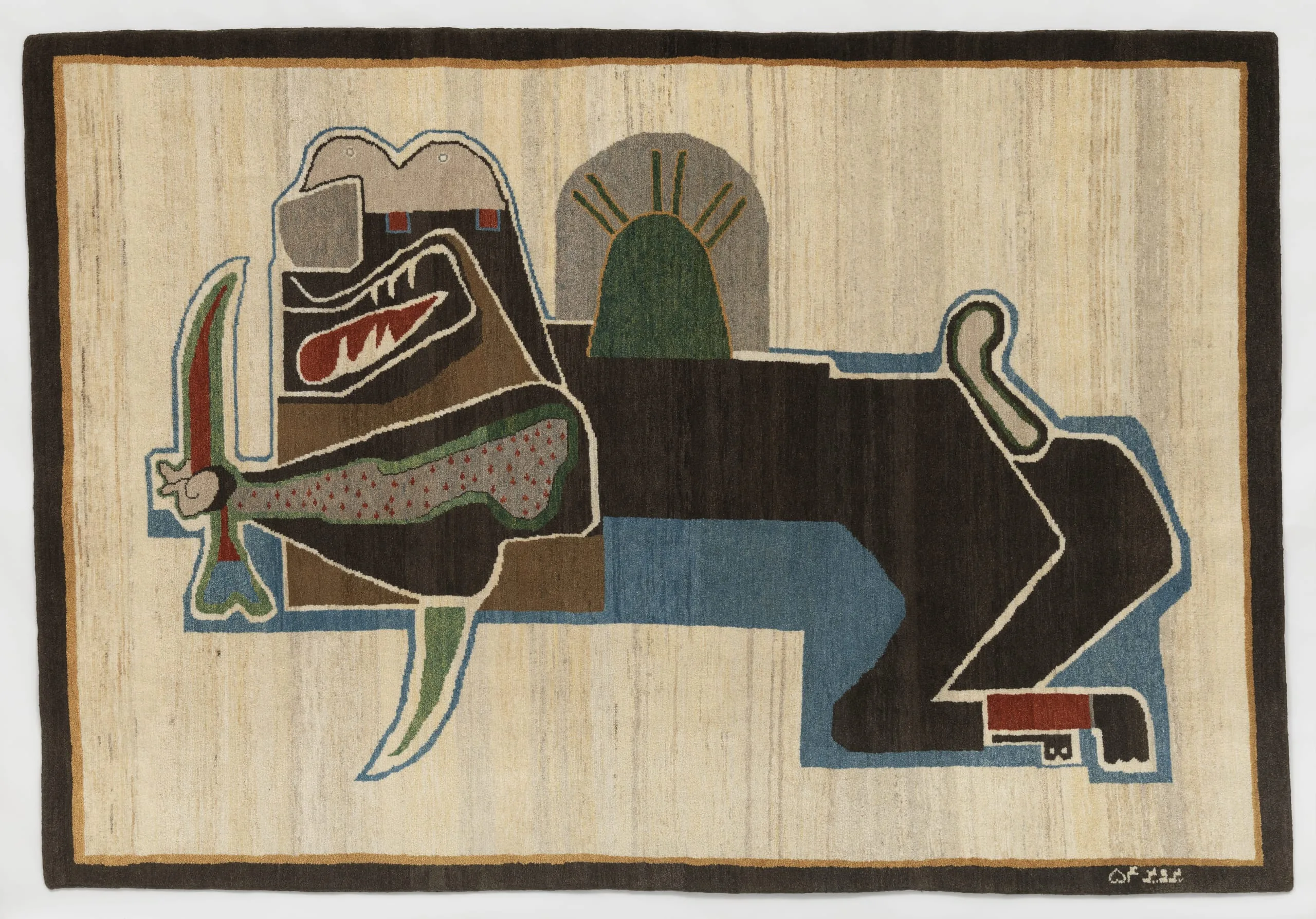 One of the founders of the Saqqakhana school, Parviz Tanavoli, in his "lion and sword" carpets, made use of a typically Persian medium while focusing on a traditional emblem of kingship and the Iranian state—a lion with the sun rising from its back. Given that the lion and sun with sword was the symbol of Pahlavi Iran, its use in the carpets, including with what appears to be an antique lock on the animal’s hind leg, suggests a subtle form of political commentary; it also reinforces the inherent Shi‘ism of the image.