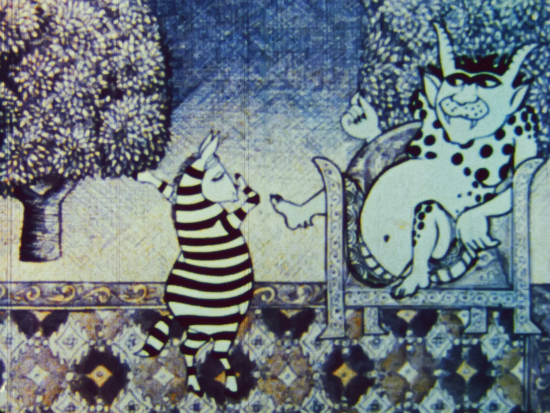 This animation presents a traditional tale of magic, villainy, and thwarted love, and visually blends nineteenth-century furnishings and costumes with contemporary (1977) elements. It includes a segment of a dancing zebra, actually an enchanted princess, whose stripes move uncannily with her body. The figure of the horned demon who bewitched the princess was based on Amir-Abbas Hoveyda, Iran’s prime minister from 1965 to 1977.