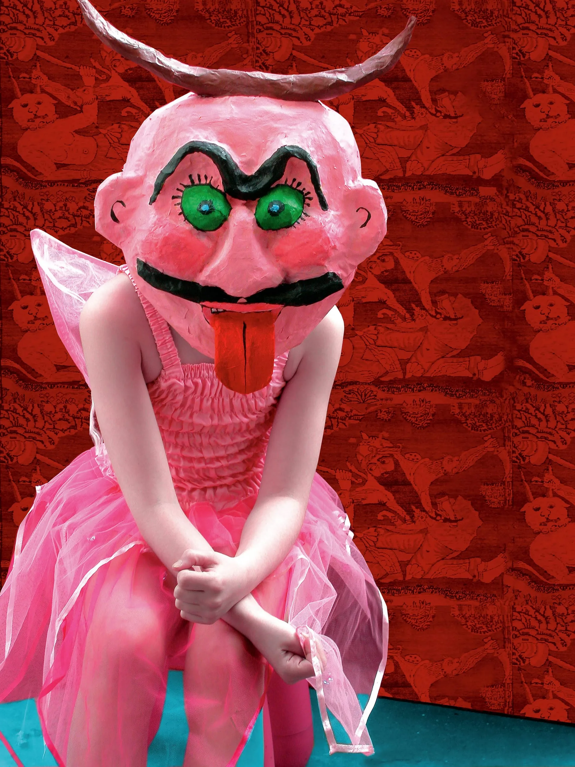 Here, Rustam combatting the White Div, the same vignette as in Malekeh Nayiny’s A Ruin from the Past (see M.2017.13.1), is re-created and repeated like wallpaper behind the horned demon. The humorous playfulness of both these Nayiny prints only partially conceals an implied darkness—the conquering of one’s own demons—and raises the question, whose face is hidden behind the grotesque pink mask? Perhaps it’s our own.