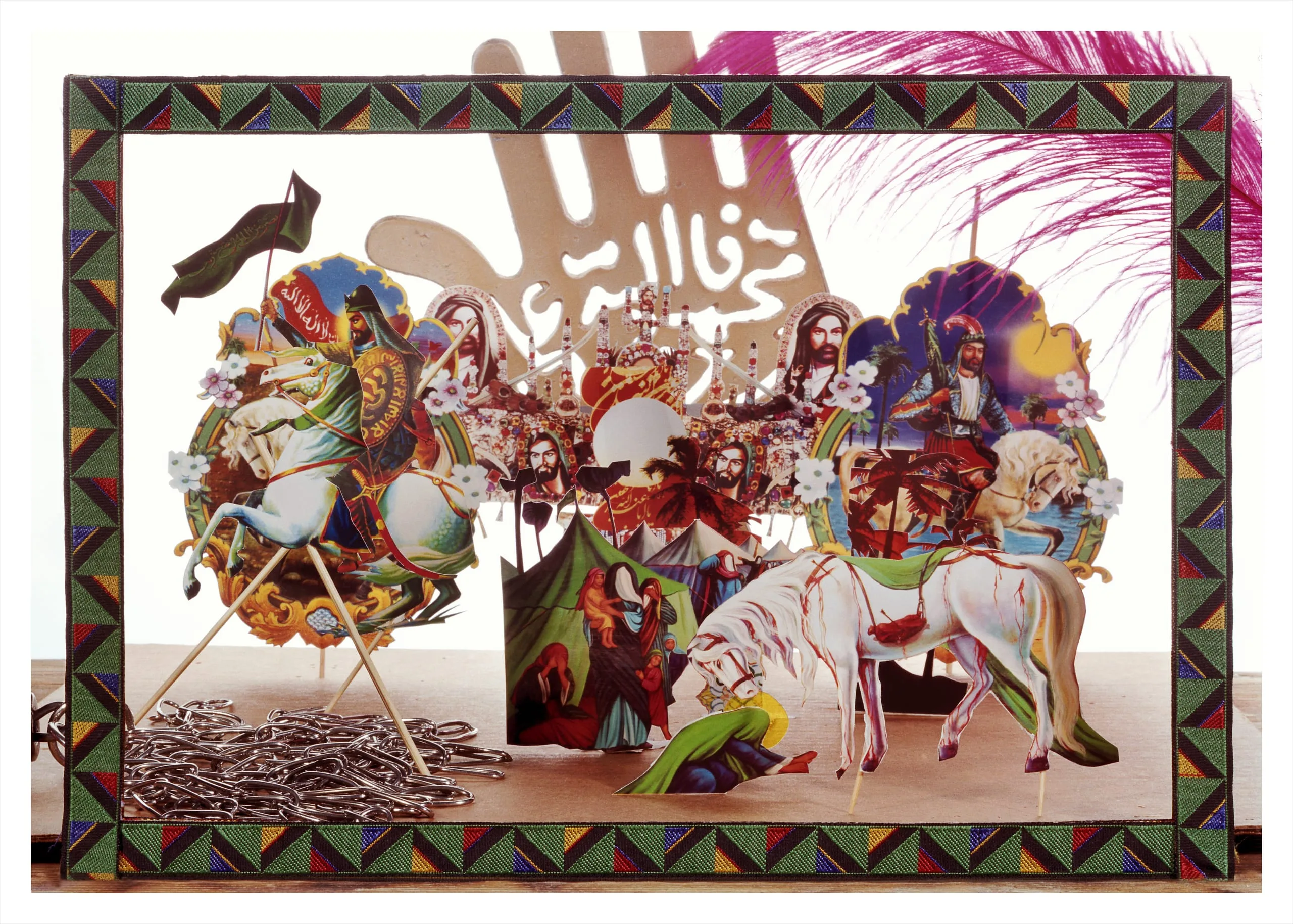 This print is from a series in which the artist collages and photographs popular images (now proscribed in Iran) commemorating the massacre of Imam Husain and his family at Karbala in 680. Such Shi‘ite imagery remains readily recognizable in Iran in much the same way that depictions of martyred Christian saints were commonplace in premodern Europe and are still well known in many places.